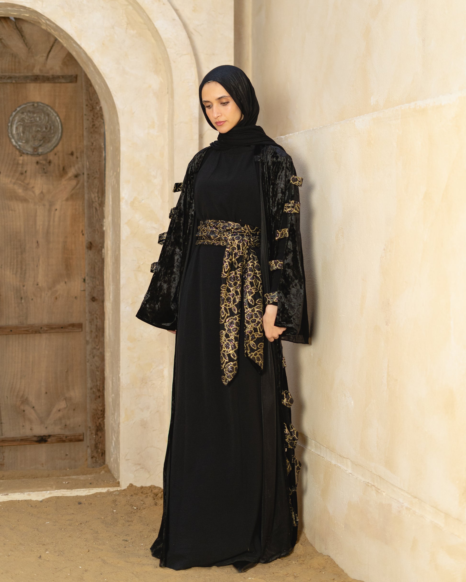 Black Velvet Abaya with Gold Lace Belt
