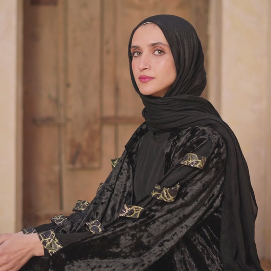 An elegant black velvet abaya designed for Ramadan evenings and special gatherings.