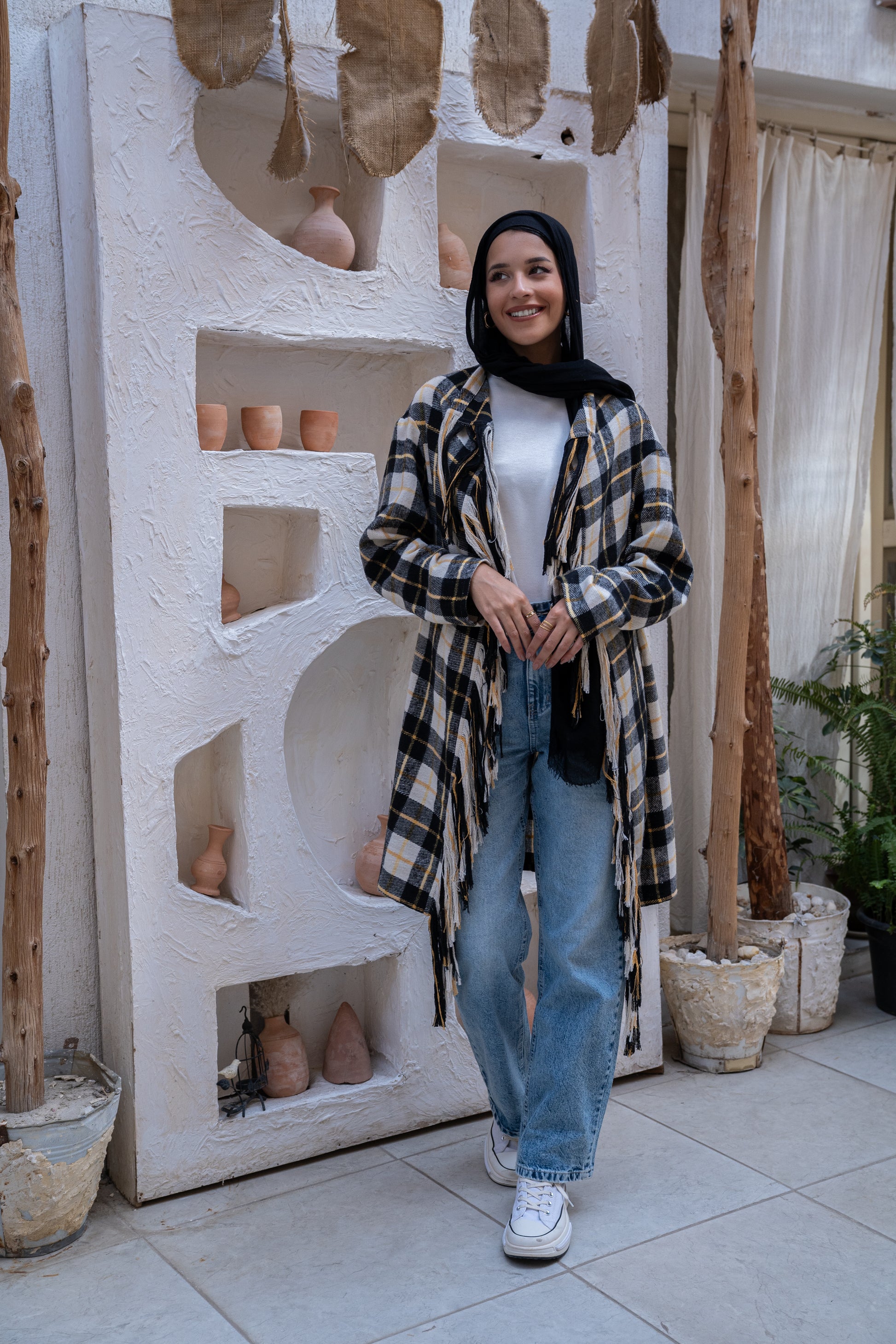 ntroducing the latest essential for your winter wardrobe: our Checked Winter Poncho with Fringes. This chic and cozy poncho is the perfect blend of style and warmth, making it a must-have for the cooler months. Crafted from a soft and warm fabric, it features a classic checked pattern that adds a touch of timeless elegance to any outfit. The playful fringes at the hem give it a unique twist, bringing movement and a touch of whimsy to your winter ensemble. Designed with modesty in mind, this poncho offers ample coverage while keeping you fashionably wrapped up against the cold. Whether layered over your favorite long sleeve tops or styled with a pair of sleek trousers, this Checked Winter Poncho with Fringes is sure to become your go-to for staying warm and stylish all season long.