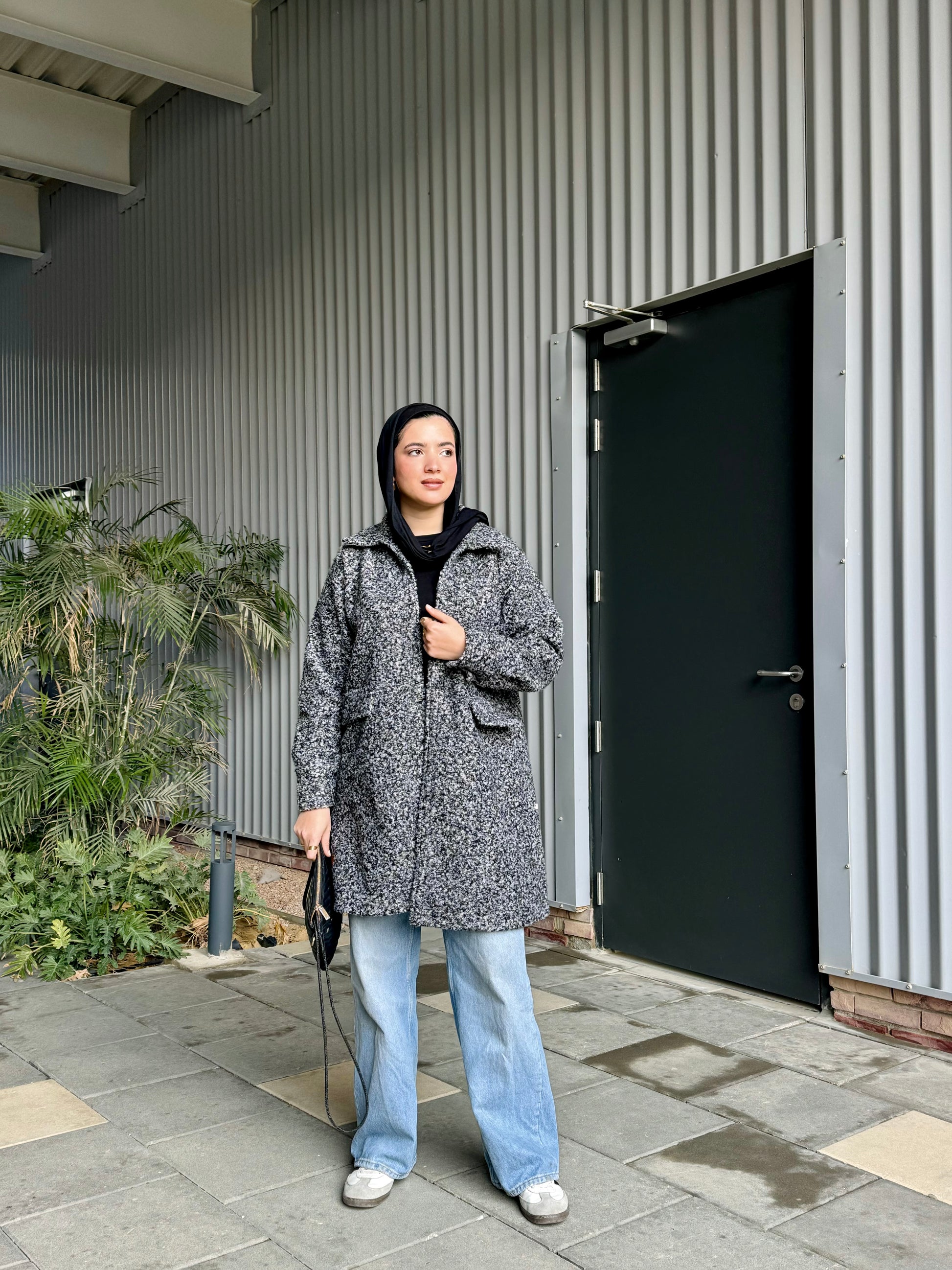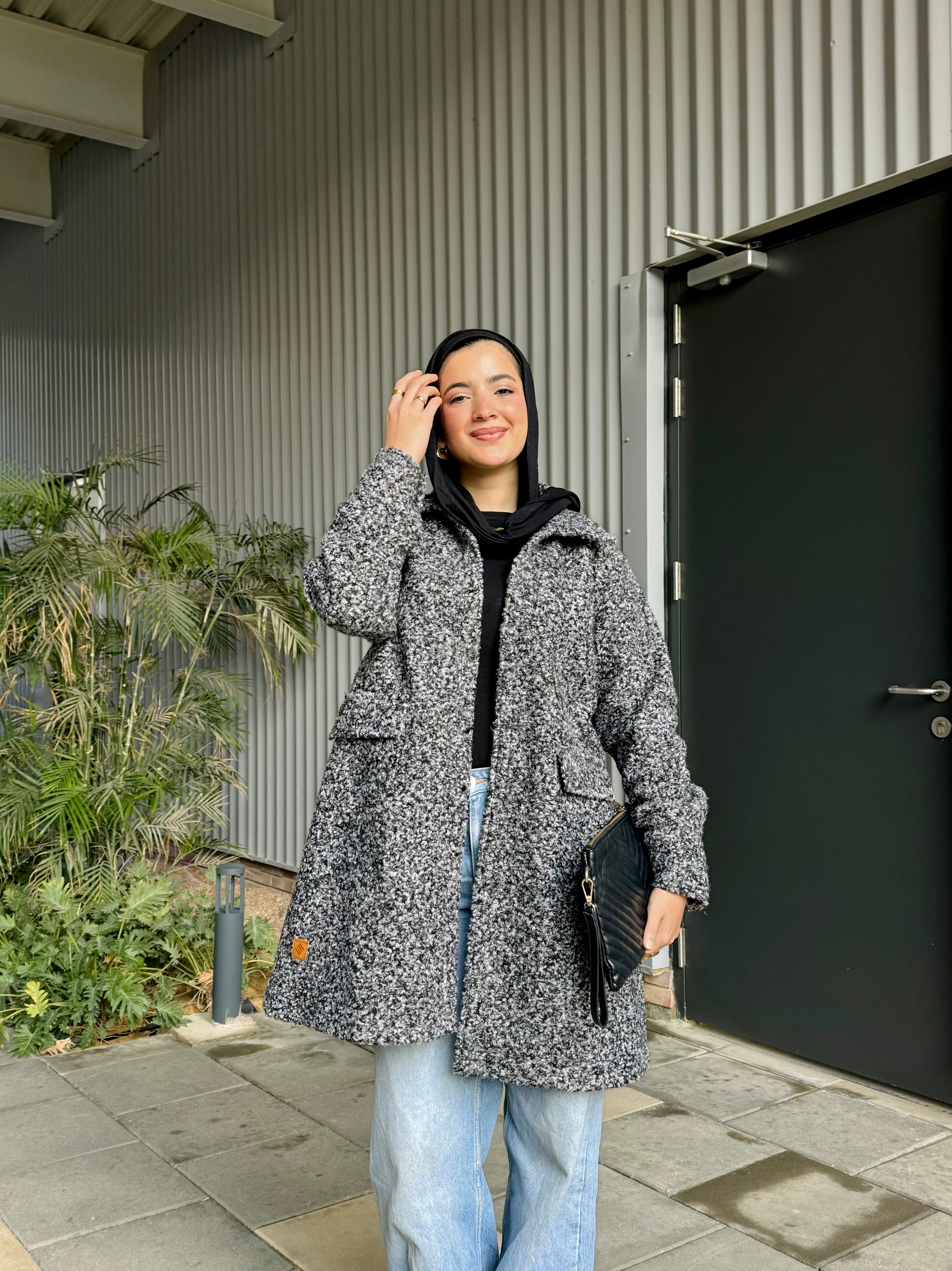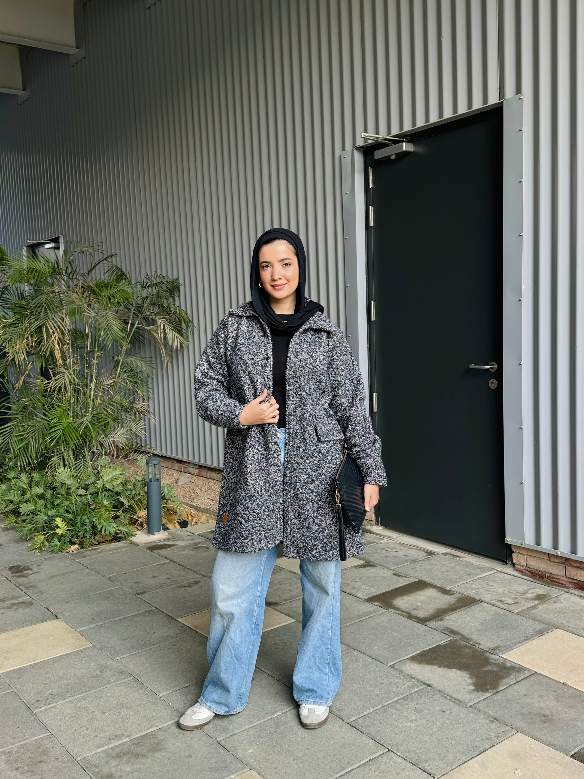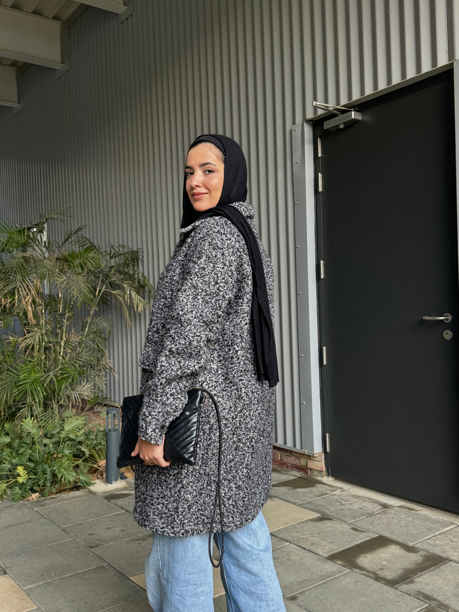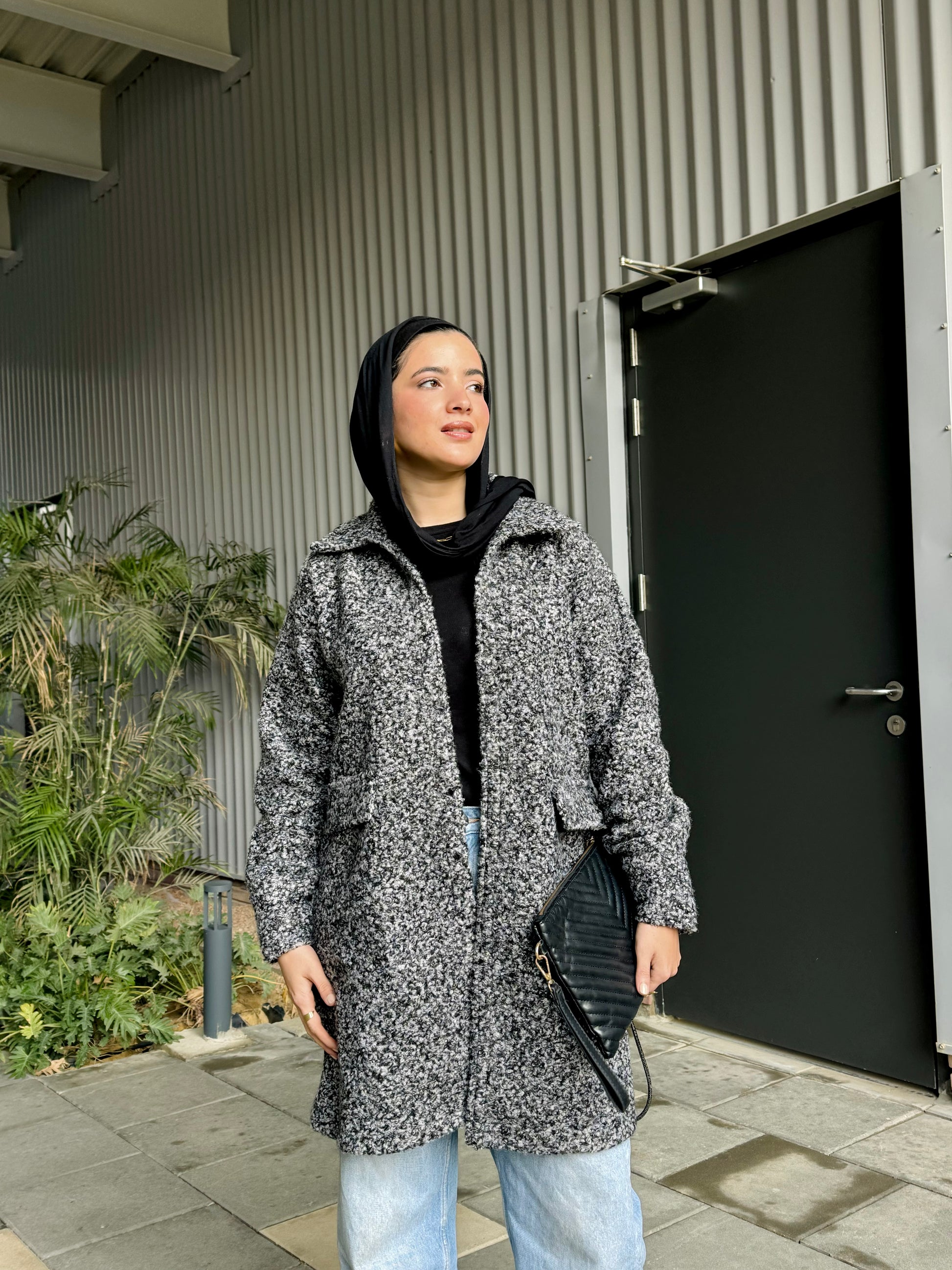 Introducing the Cloud Coat, where sophistication meets modesty in a symphony of monochrome. Crafted with the modern woman in mind, this piece is more than just a garment; it's a declaration of style and empowerment. With its luxurious black and white fabric, the Cloud Coat seamlessly blends timeless elegance with contemporary modest wear.