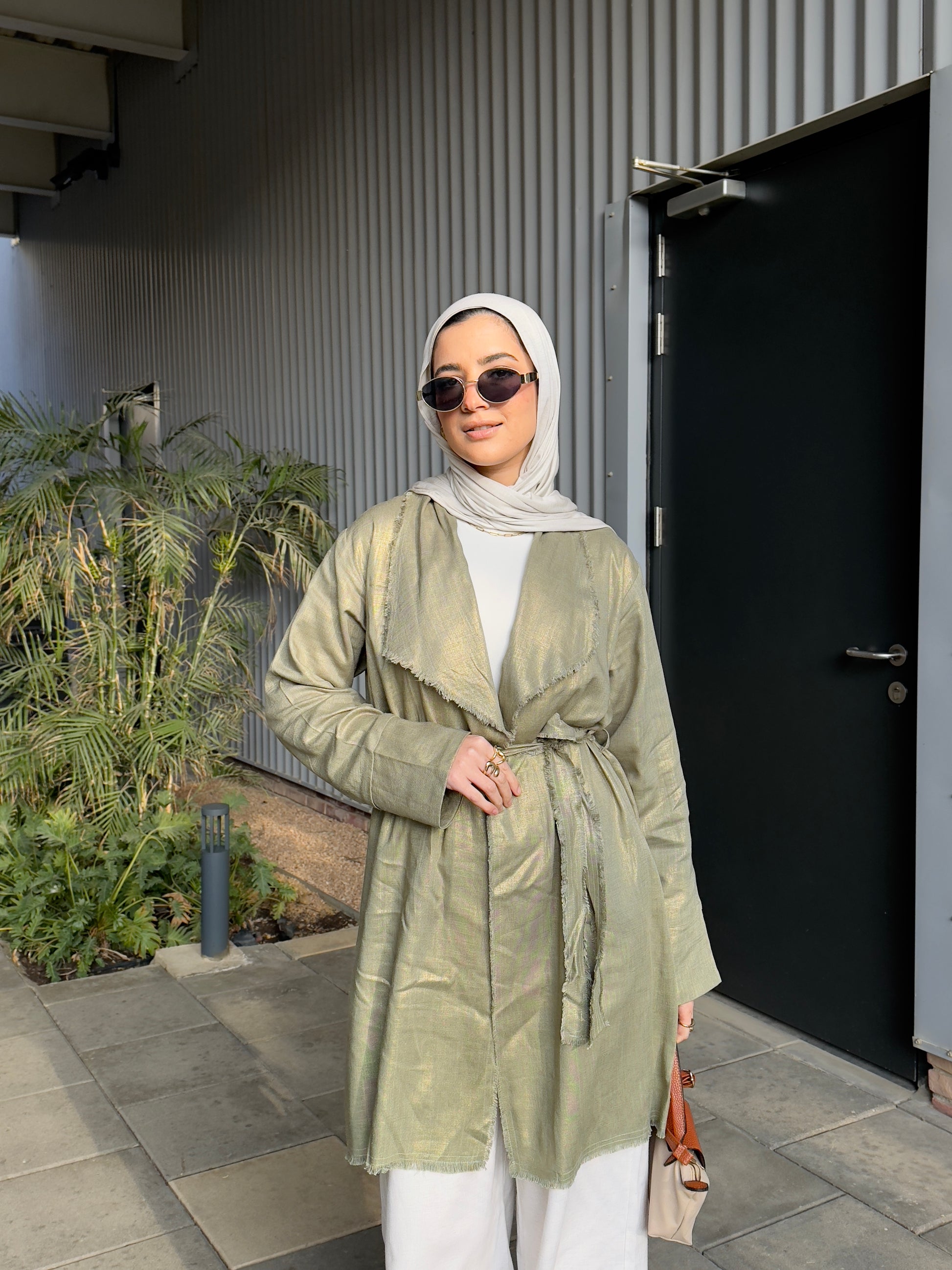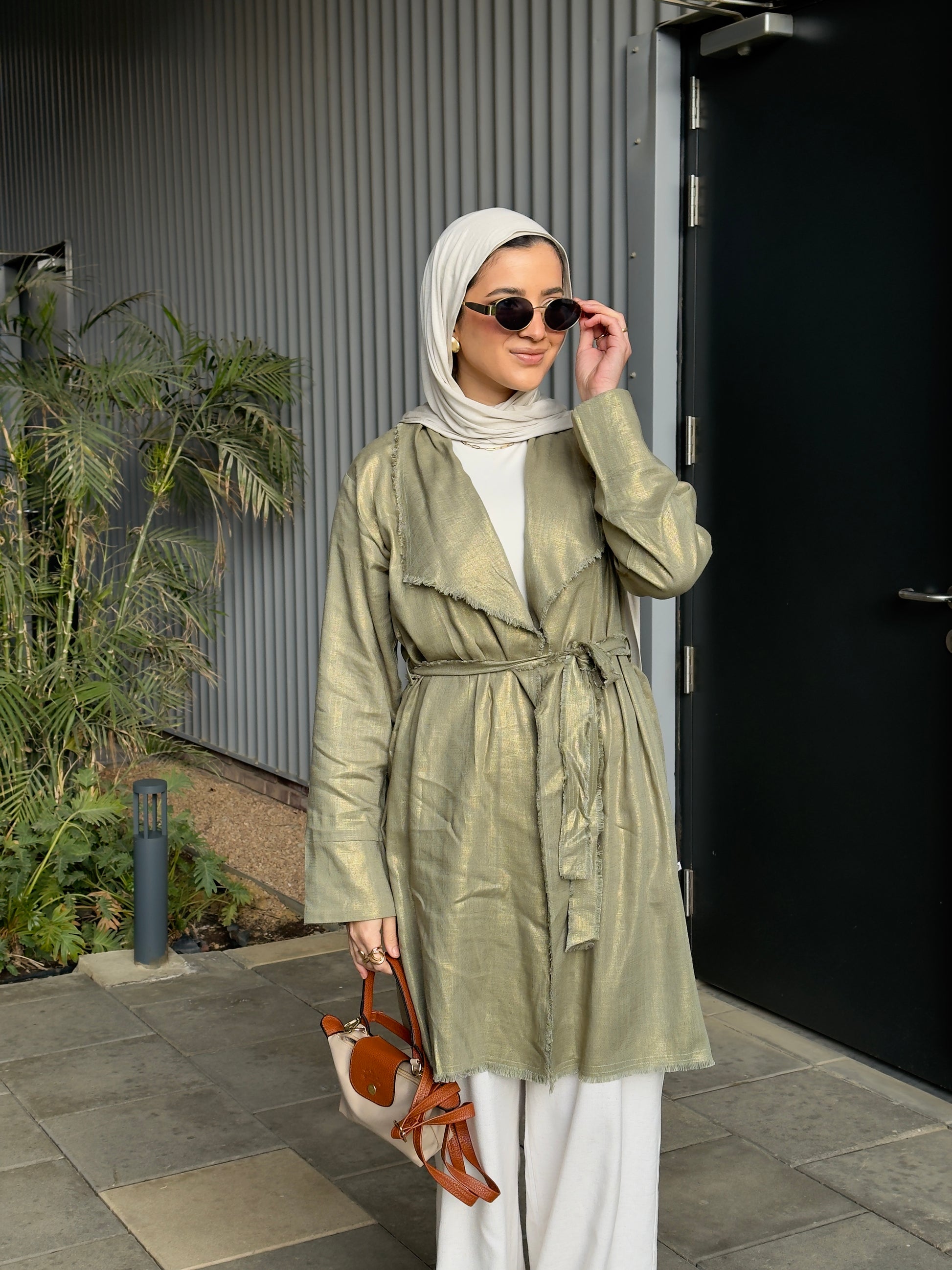 your new go-to for adding a touch of elegance to any outfit. This exquisite piece, crafted from a premium shiny linen blend, effortlessly combines comfort with chic style. The subtle beige color evokes the warmth and serenity of desert sands under the sun, making it a versatile addition to your wardrobe. Its lightweight construction ensures breathability, while the shimmering finish catches the light beautifully, transitioning seamlessly from day to night wear. Featuring a relaxed fit and open front design, the Desert Gleam Cardigan is perfect for layering over your favorite ensembles, adding a refined finish to both casual and sophisticated looks.