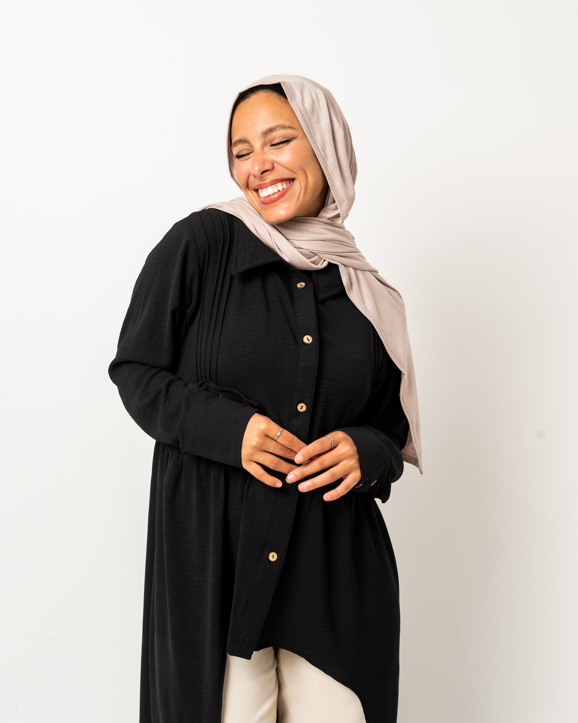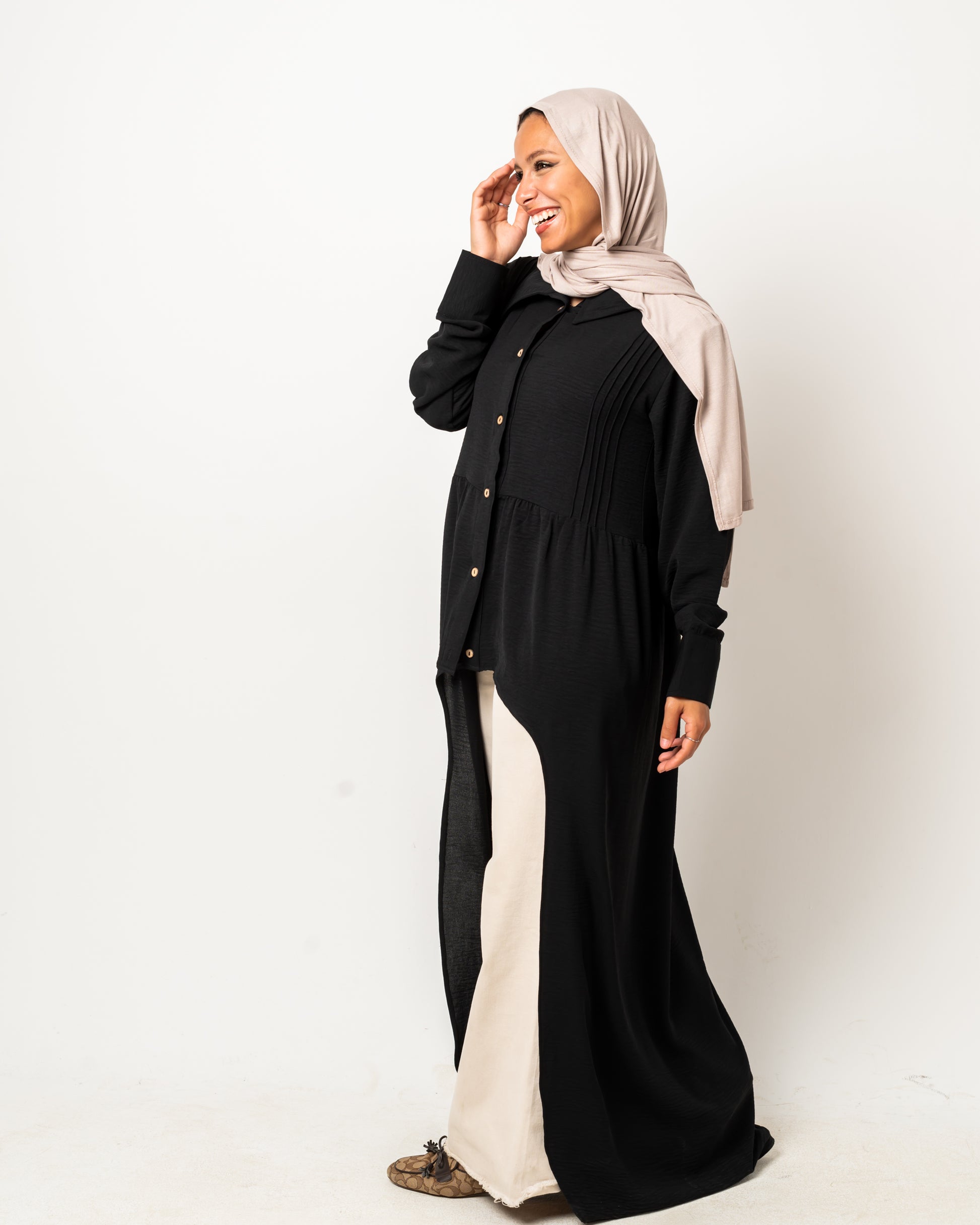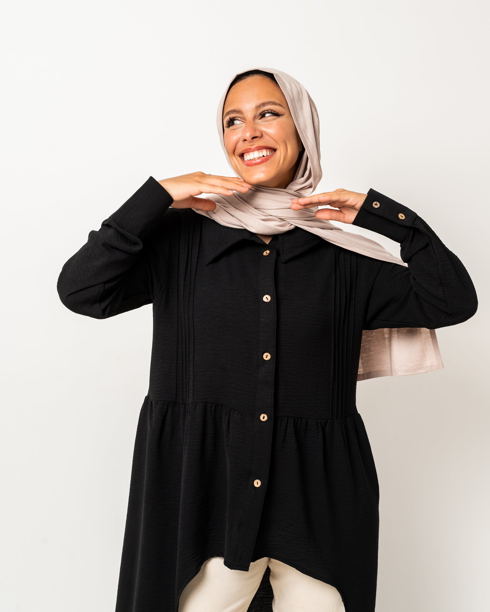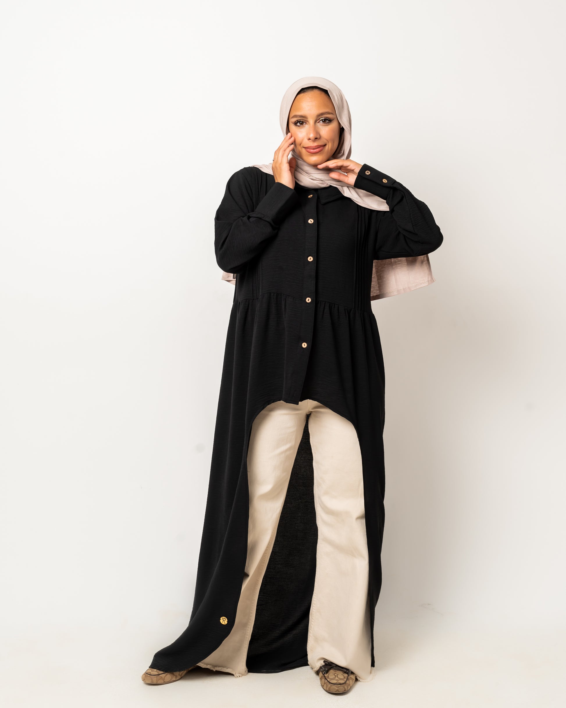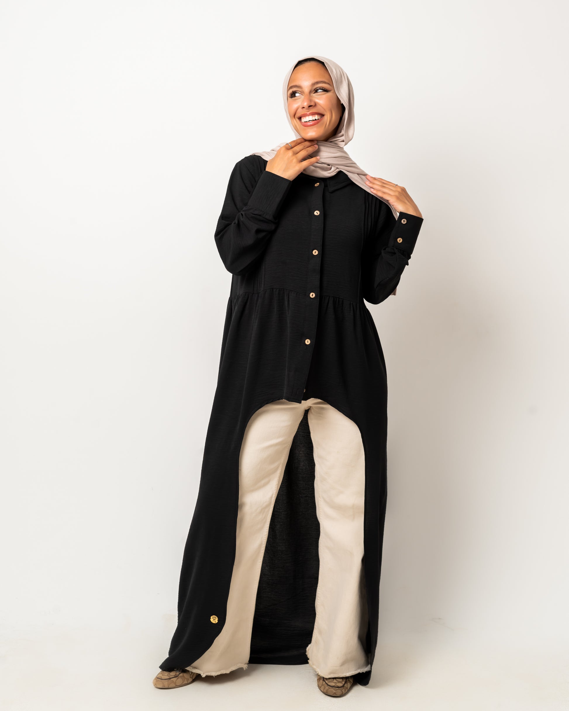 Our High Low Flared Dress in Black is crafted from soft cotton and designed with wooden buttons for a timeless look.