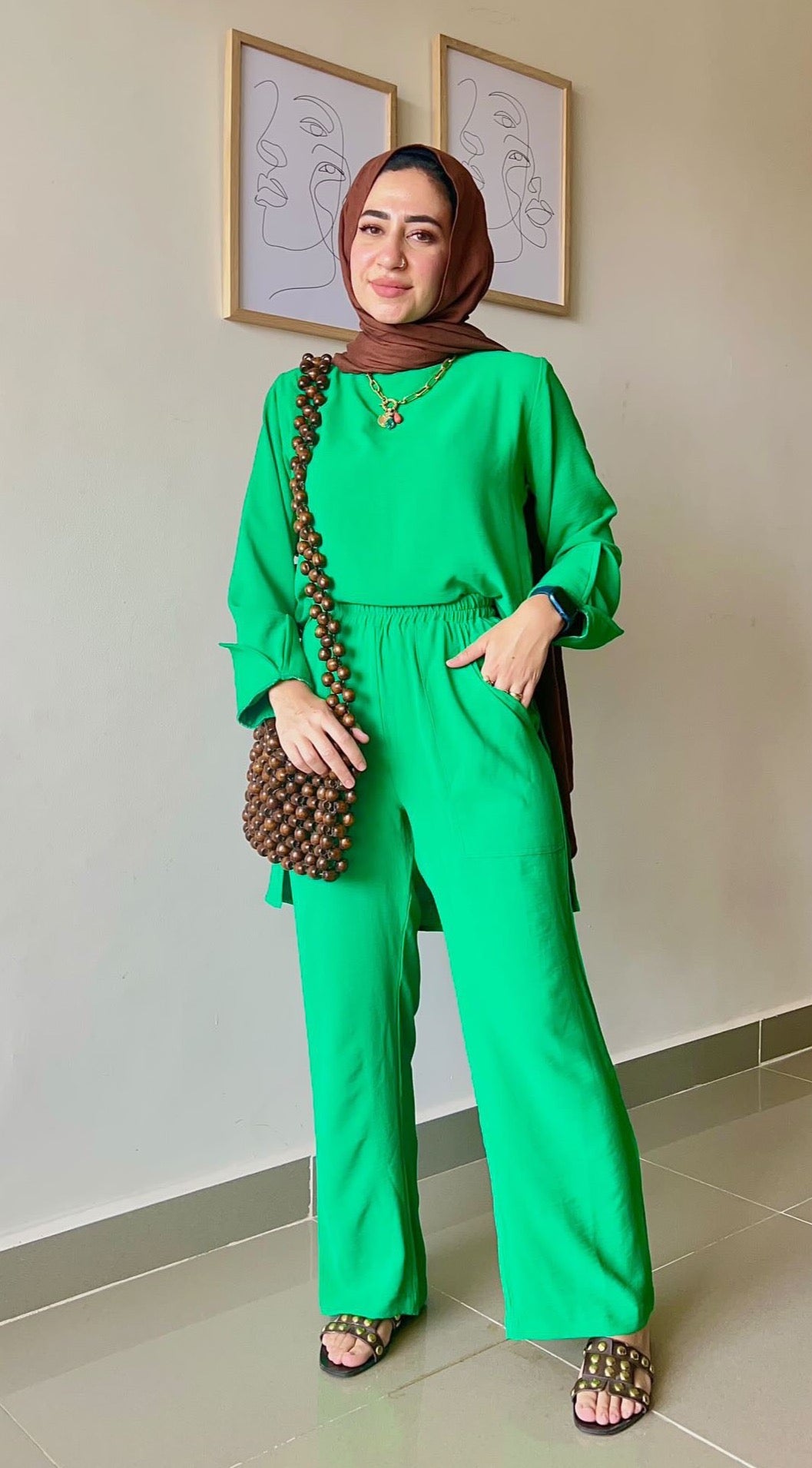 Fashionable and stylish two piece set. These high low top and straight pull on pant are made of quality material, with a comfortable feel.