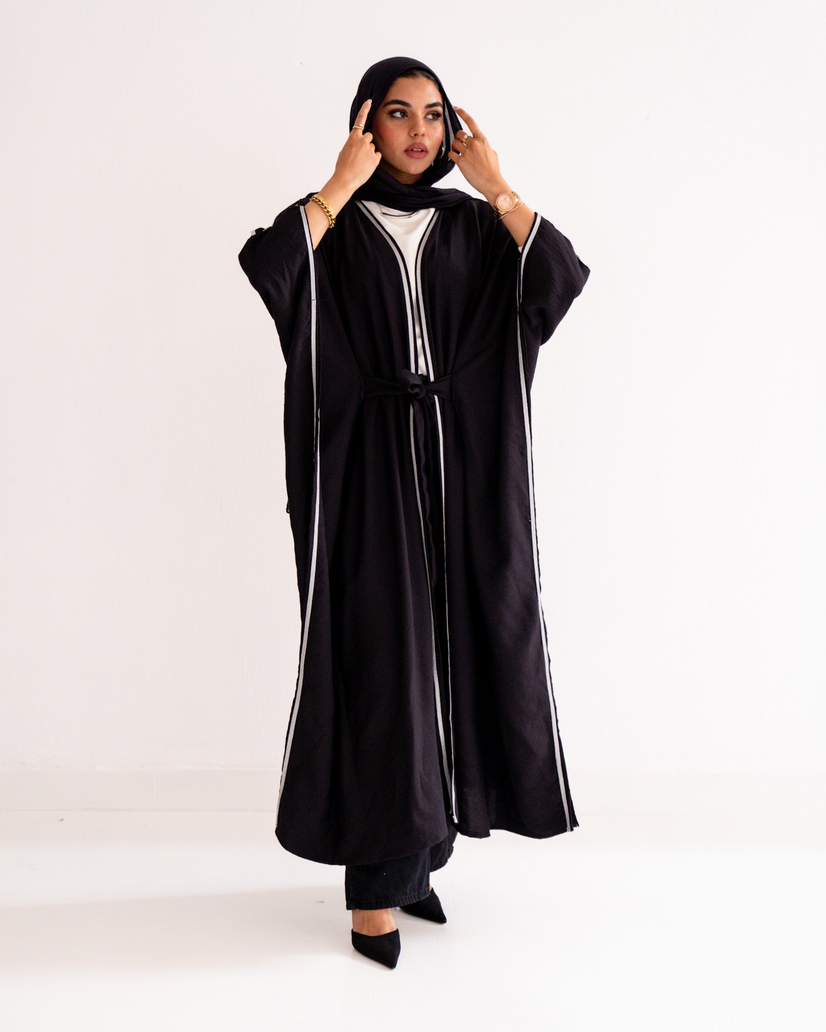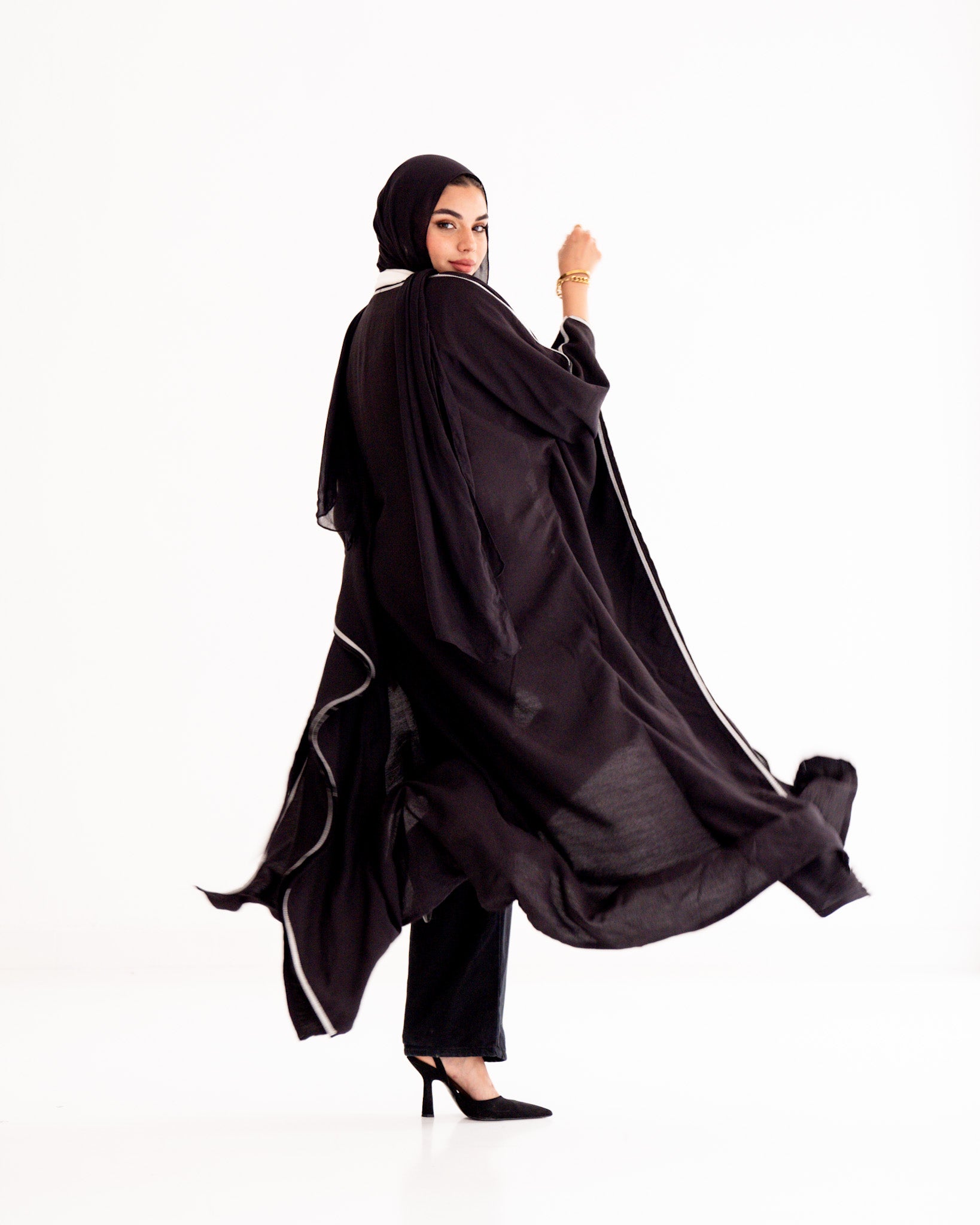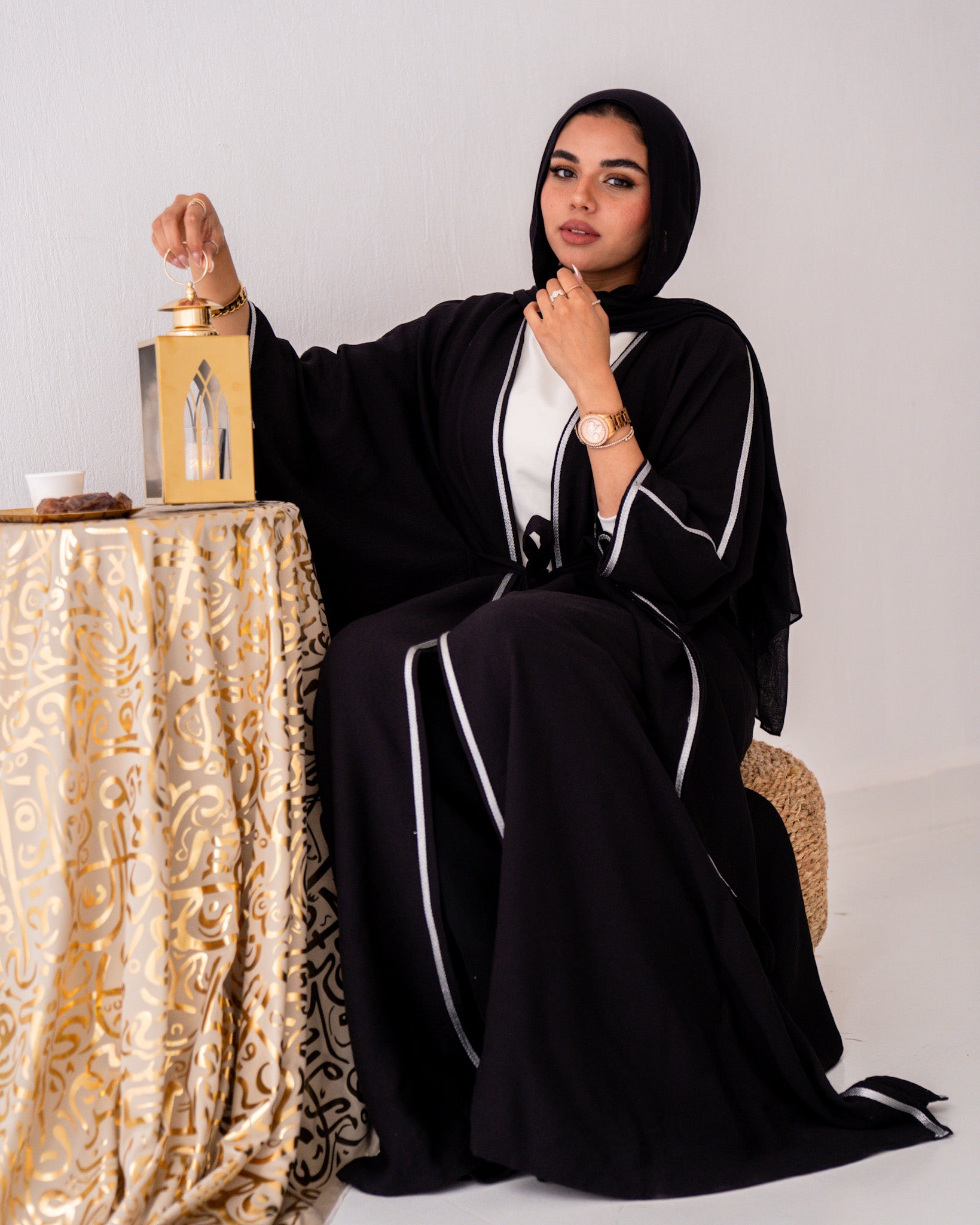 mbrace the sublime fusion of simplicity and grace with our Midnight Elegance Butterfly Abaya. Crafted from fluid, luxurious fabric, this abaya features a timeless black silhouette accentuated with subtle grey lining, presenting an aura of understated elegance. Designed with the iconic butterfly cut, it offers a flattering, breezy fit that gracefully flutters with every step you take. Perfect for both serene Ramadan nights and sophisticated Eid celebrations, this piece promises to elevate your wardrobe with its classic allure and contemporary charm.