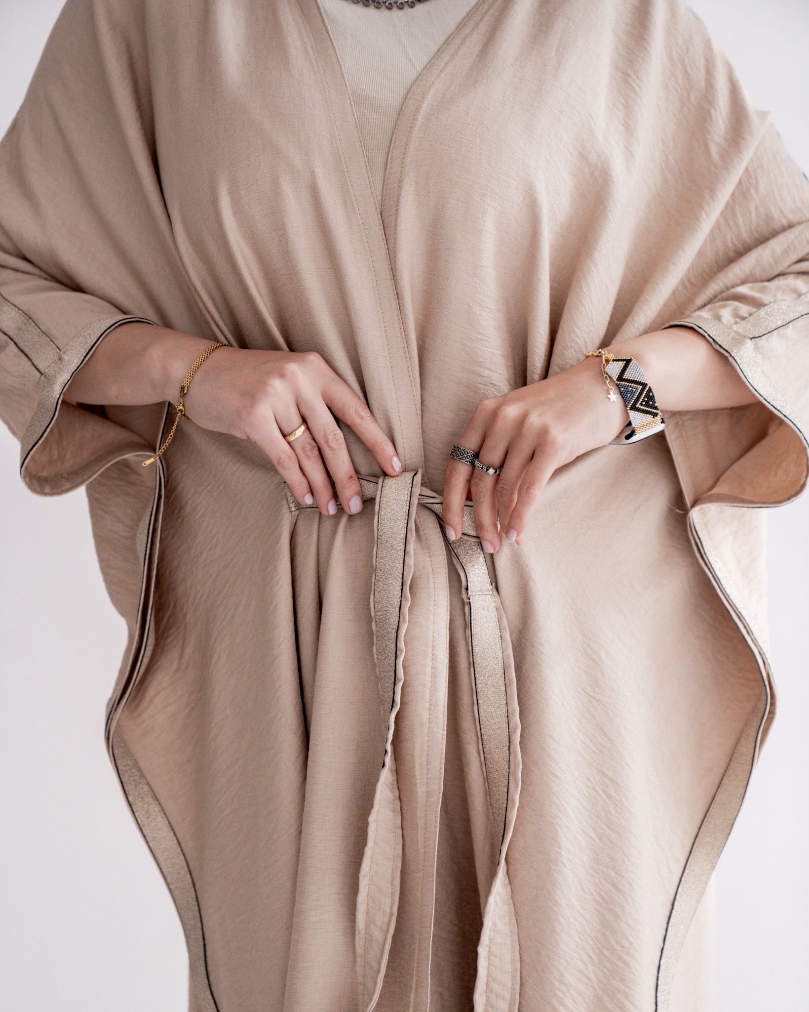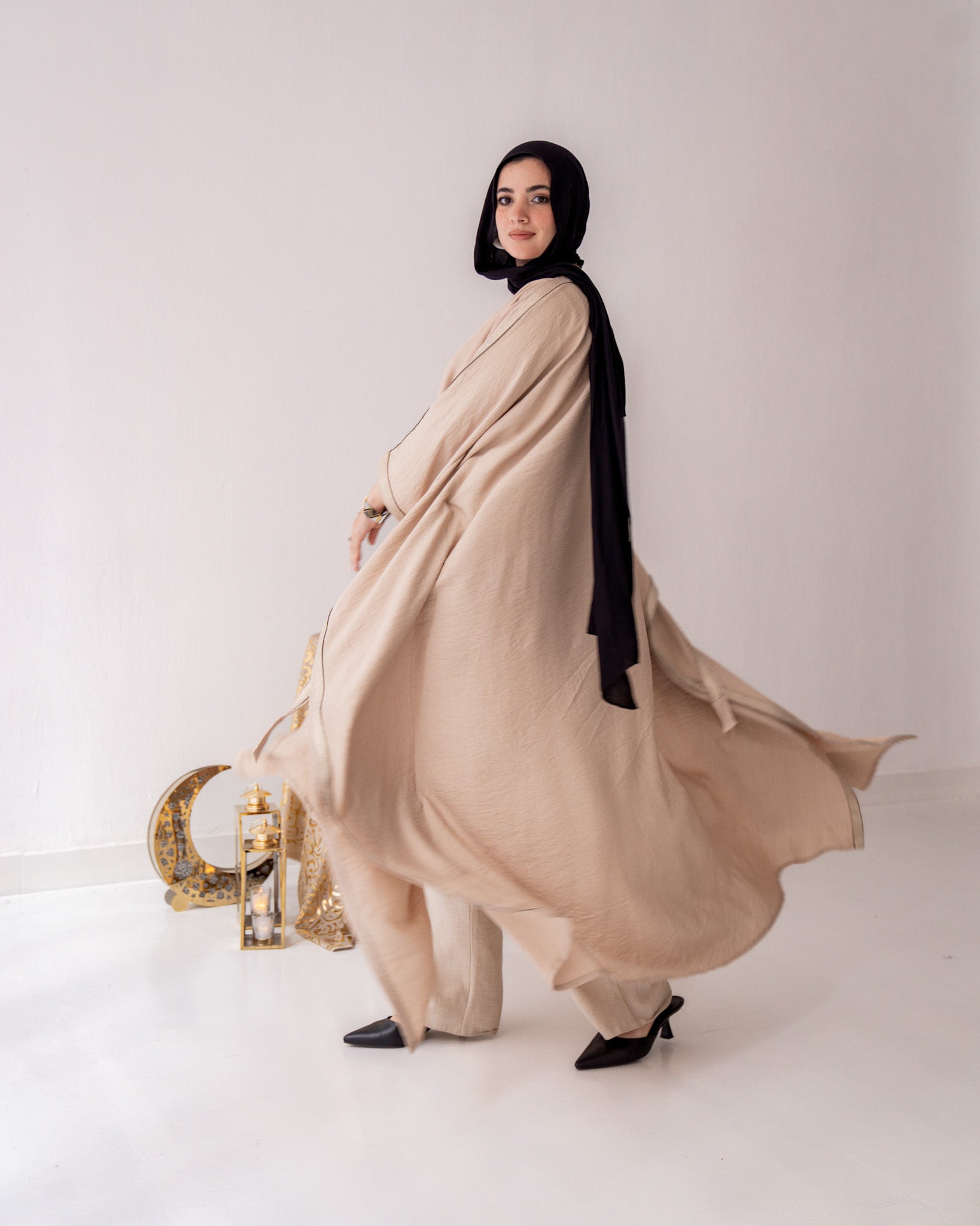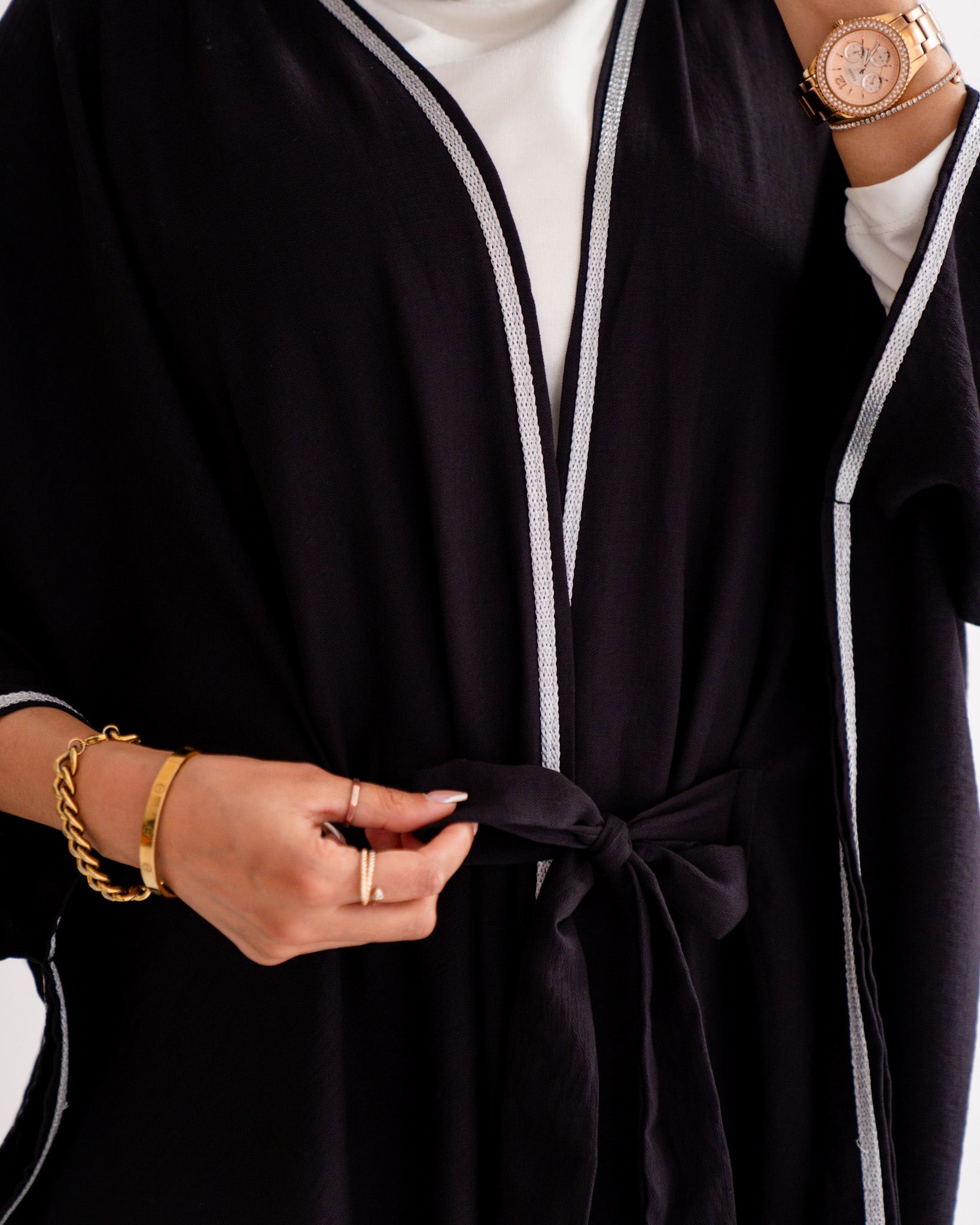 mbrace the sublime fusion of simplicity and grace with our Midnight Elegance Butterfly Abaya. Crafted from fluid, luxurious fabric, this abaya features a timeless black silhouette accentuated with subtle grey lining, presenting an aura of understated elegance. Designed with the iconic butterfly cut, it offers a flattering, breezy fit that gracefully flutters with every step you take. Perfect for both serene Ramadan nights and sophisticated Eid celebrations, this piece promises to elevate your wardrobe with its classic allure and contemporary charm.