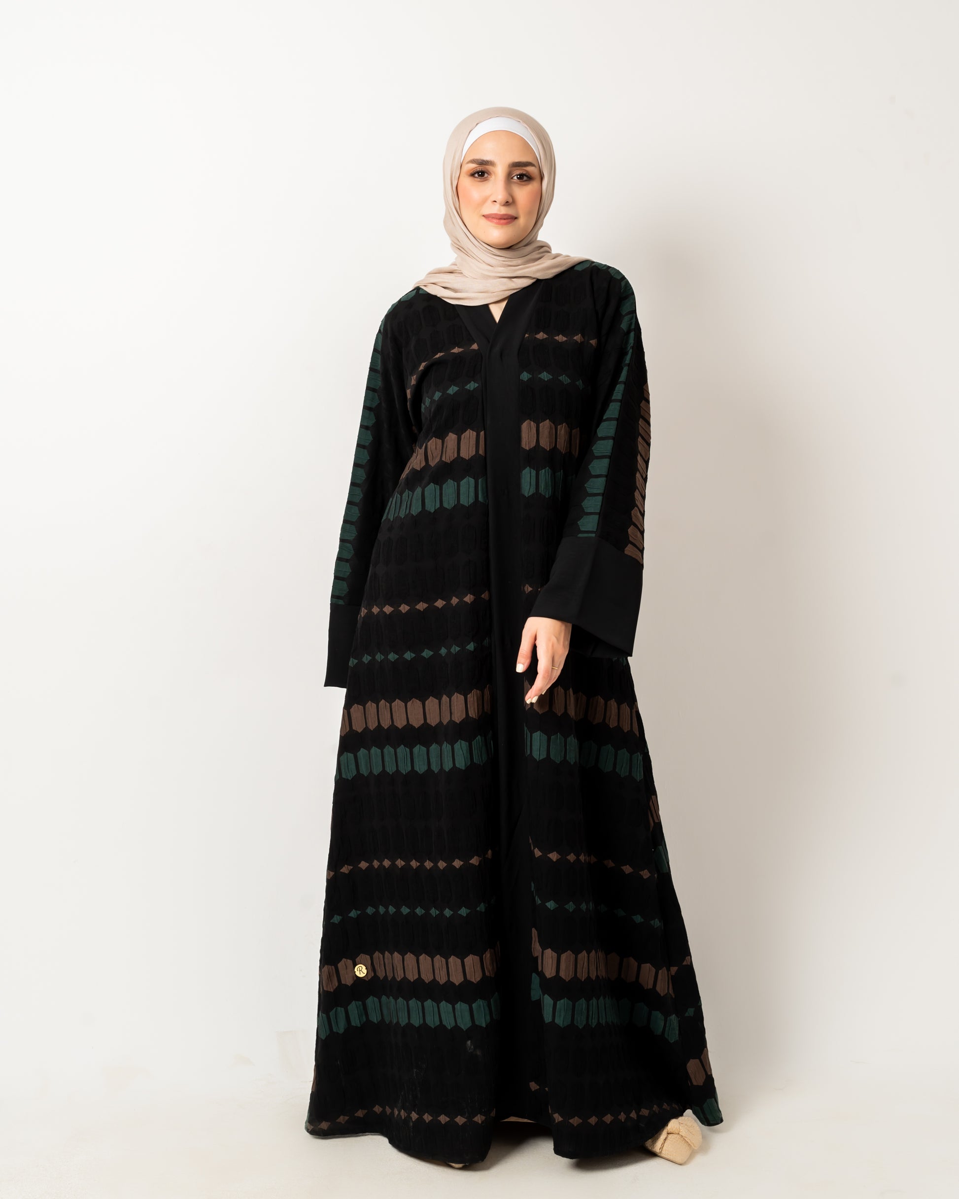 A new closhe Abaya , with a fresh and modern attitude timelessly elegant in rich fabric mint beige and black patterns.