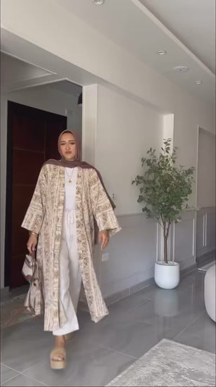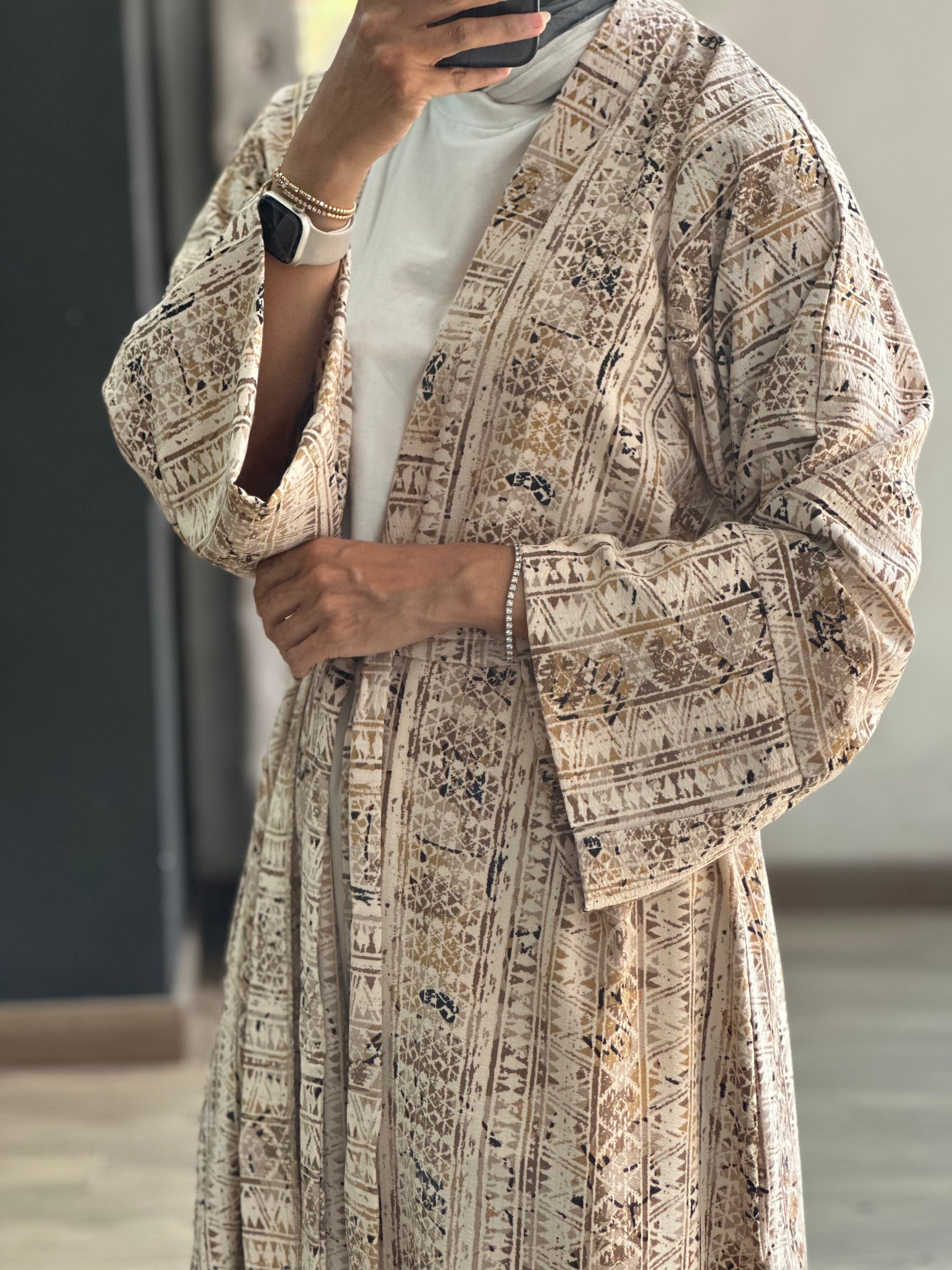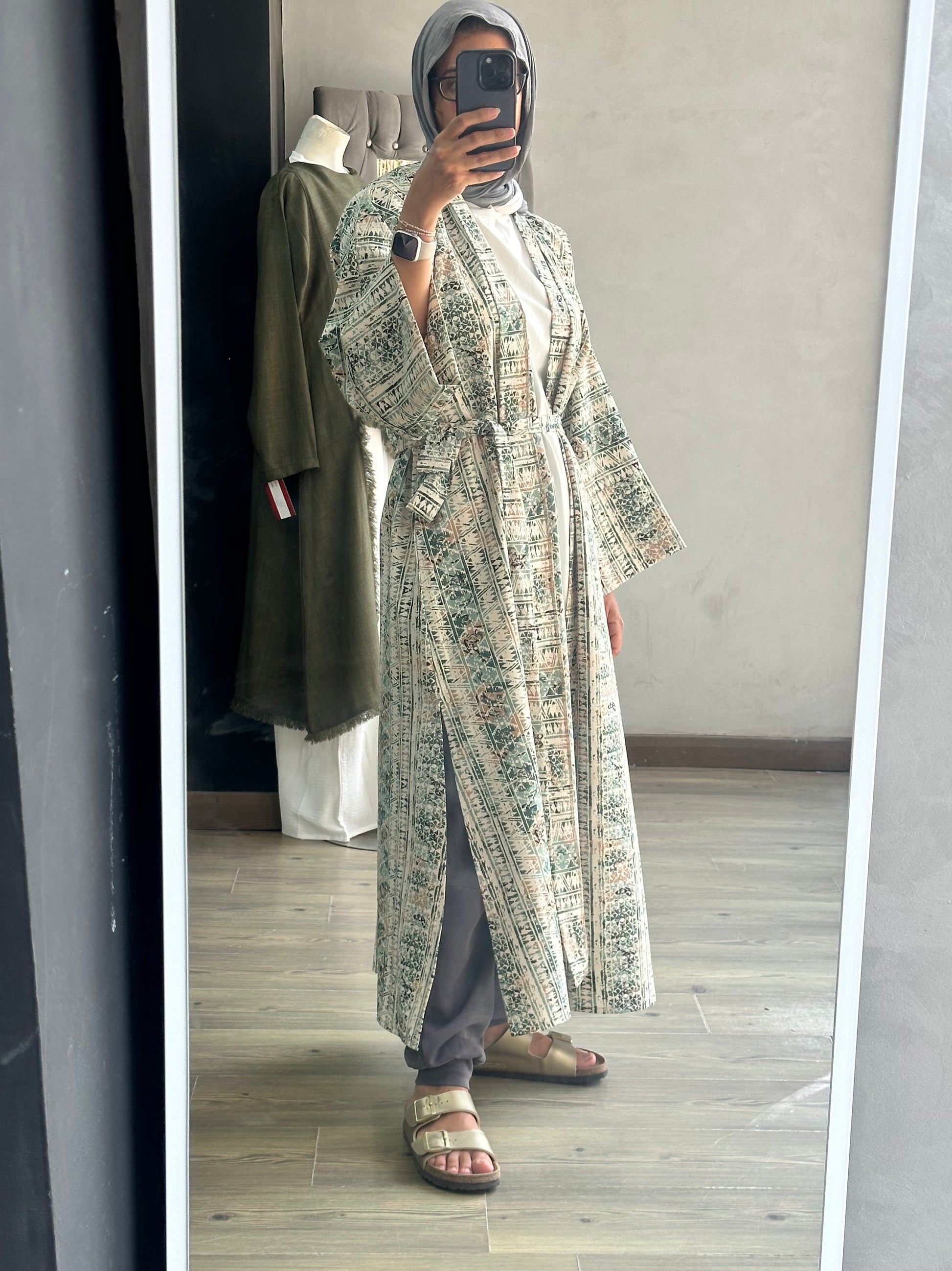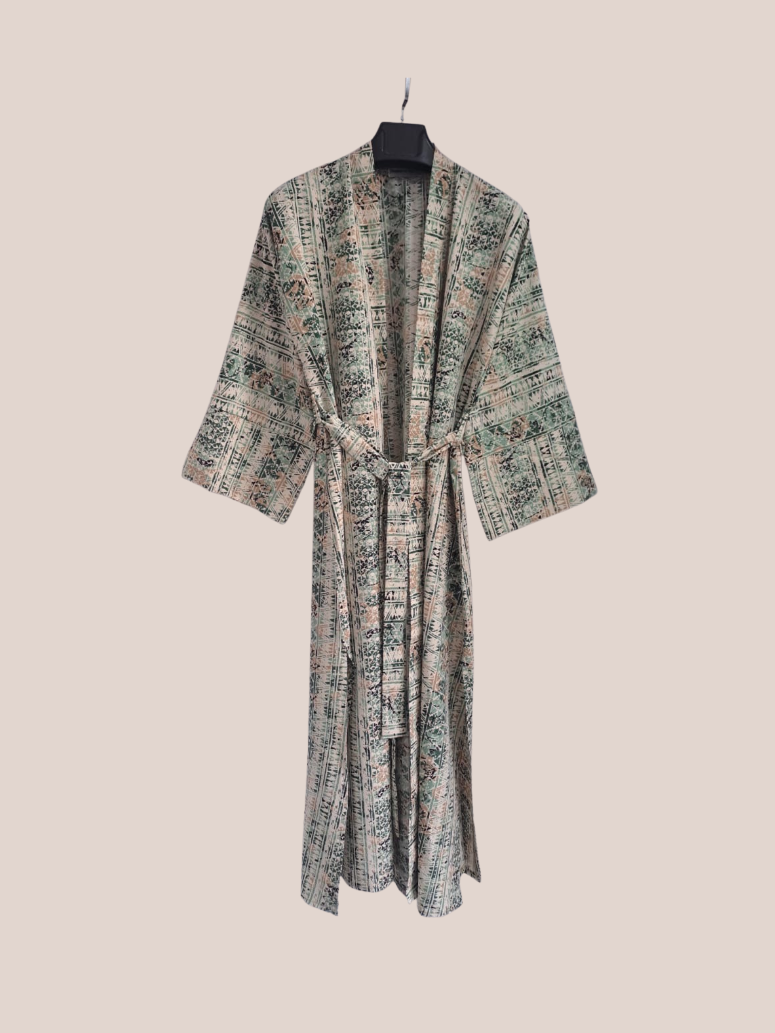 Wrap yourself in elegance with the Dusk Kimono Cardigan, a long, flowy piece featuring a washed oriental pattern that evokes timeless charm. Designed with modesty in mind, it offers side slits for graceful movement and a detachable belt to cinch at the waist for a flattering silhouette. Perfect for layering, this lightweight cardigan blends tradition with contemporary style.
