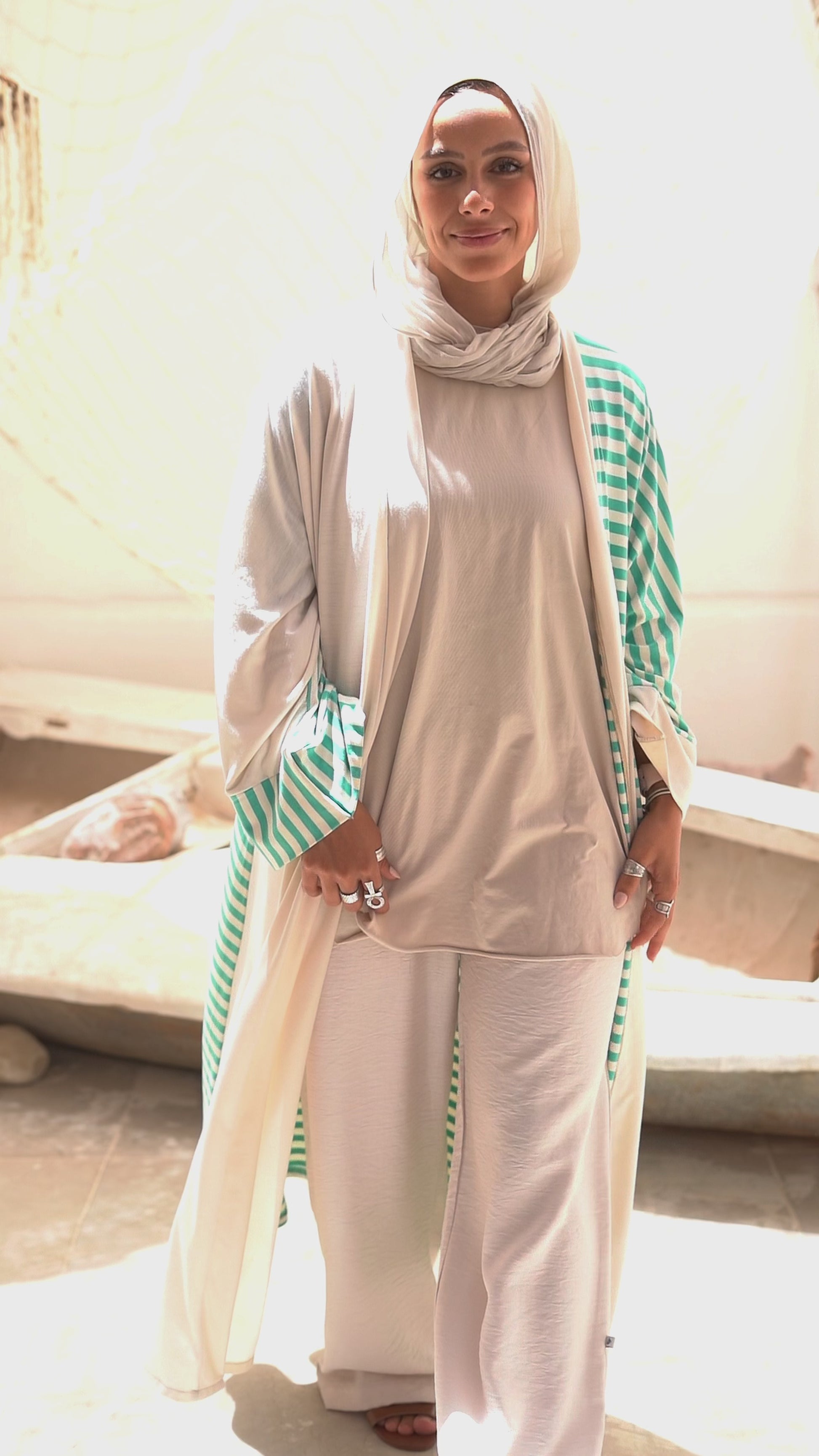 One side boasts a bold, striped pattern in shades of turquoise, perfect for adding a pop of color and pattern to your outfit. Flip it, and you reveal its versatile plain side, a classic look that complements any ensemble with ease. The true beauty of this cardigan lies in its reversibility. Transform your look in an instant without sacrificing style or comfort. It's like owning two cardigans in one!