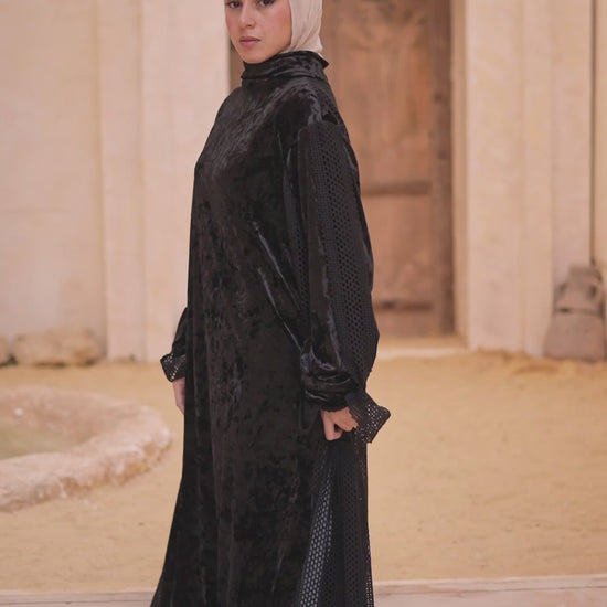 Crafted from soft velvet with a textured outer layer, this abaya creates a rich, dimensional look while remaining elegant and balanced. The fabric flows beautifully with movement, giving the piece a calm yet elevated presence.