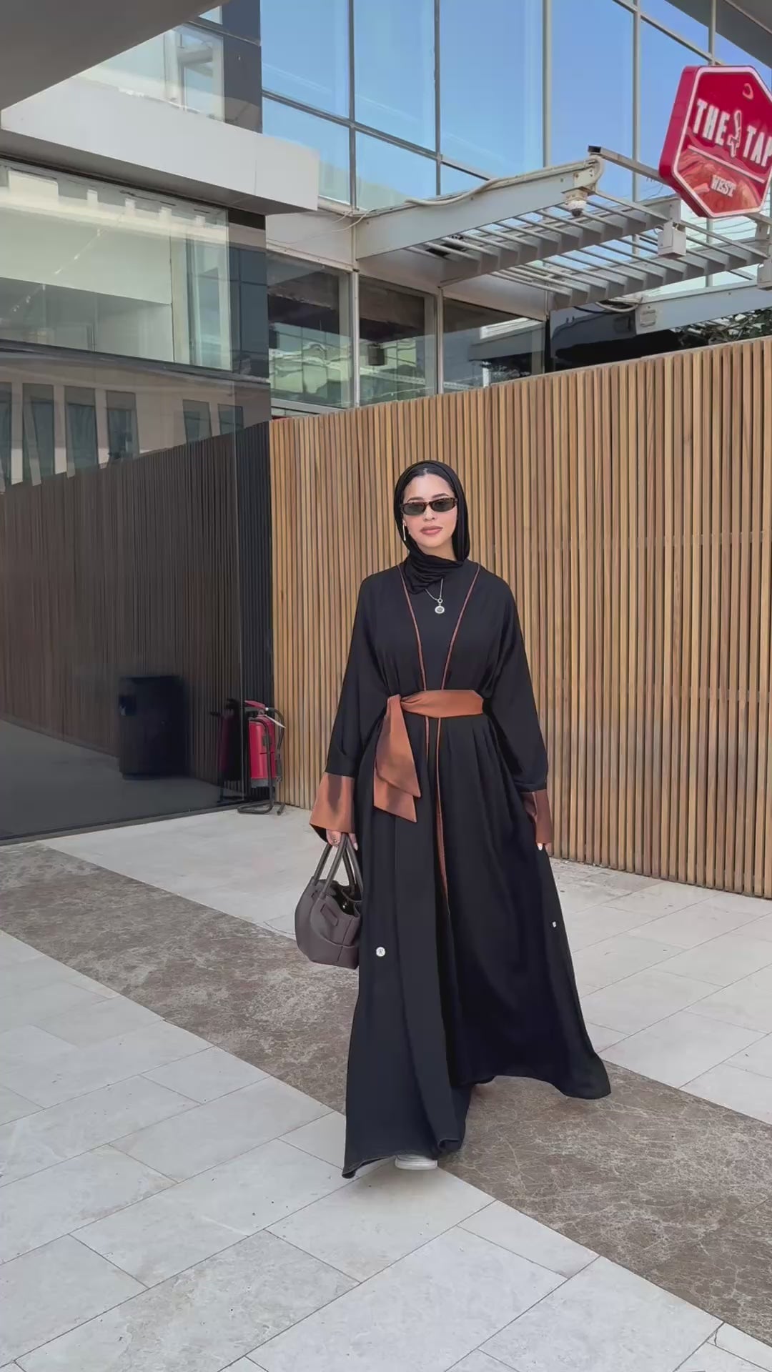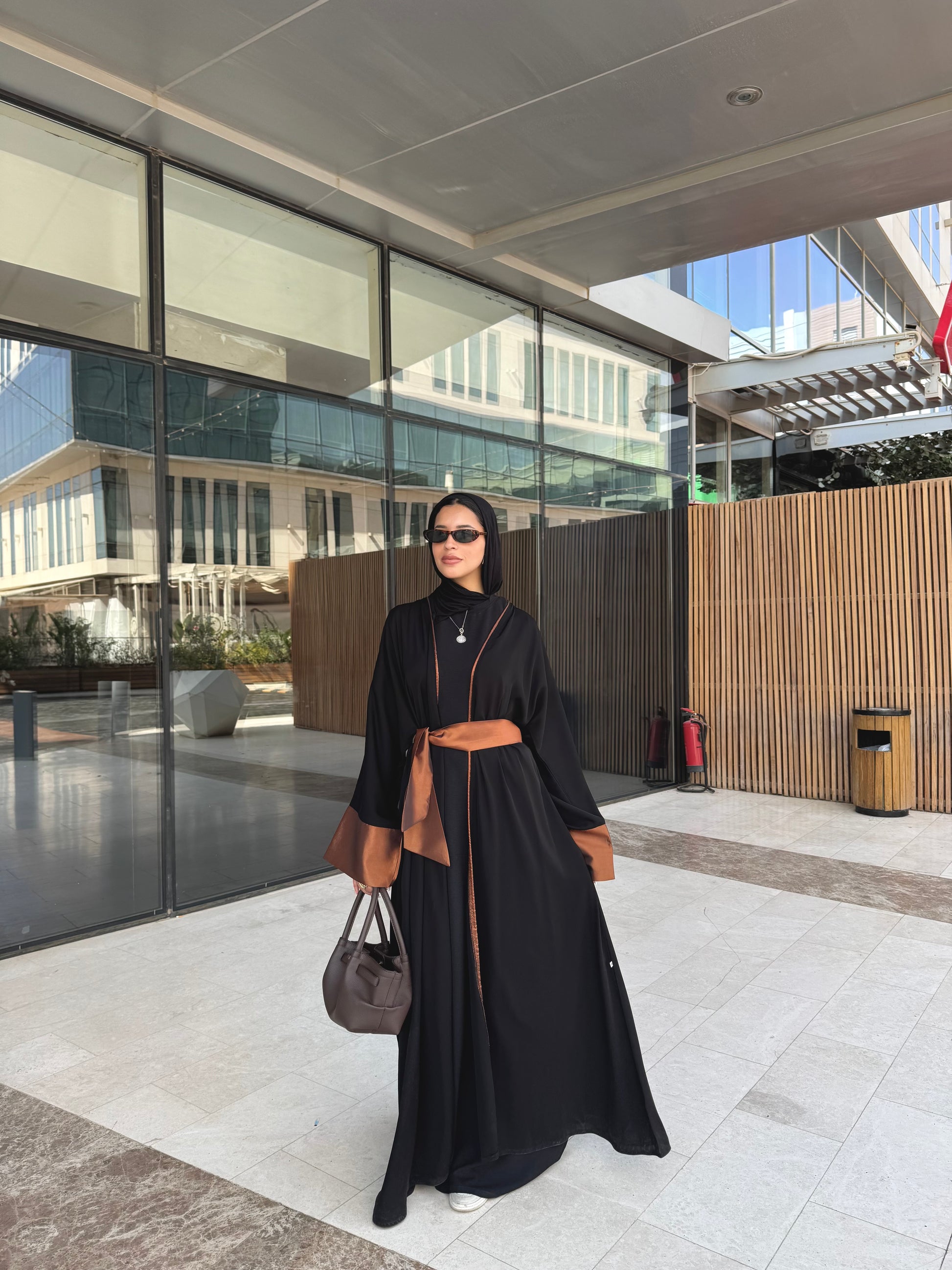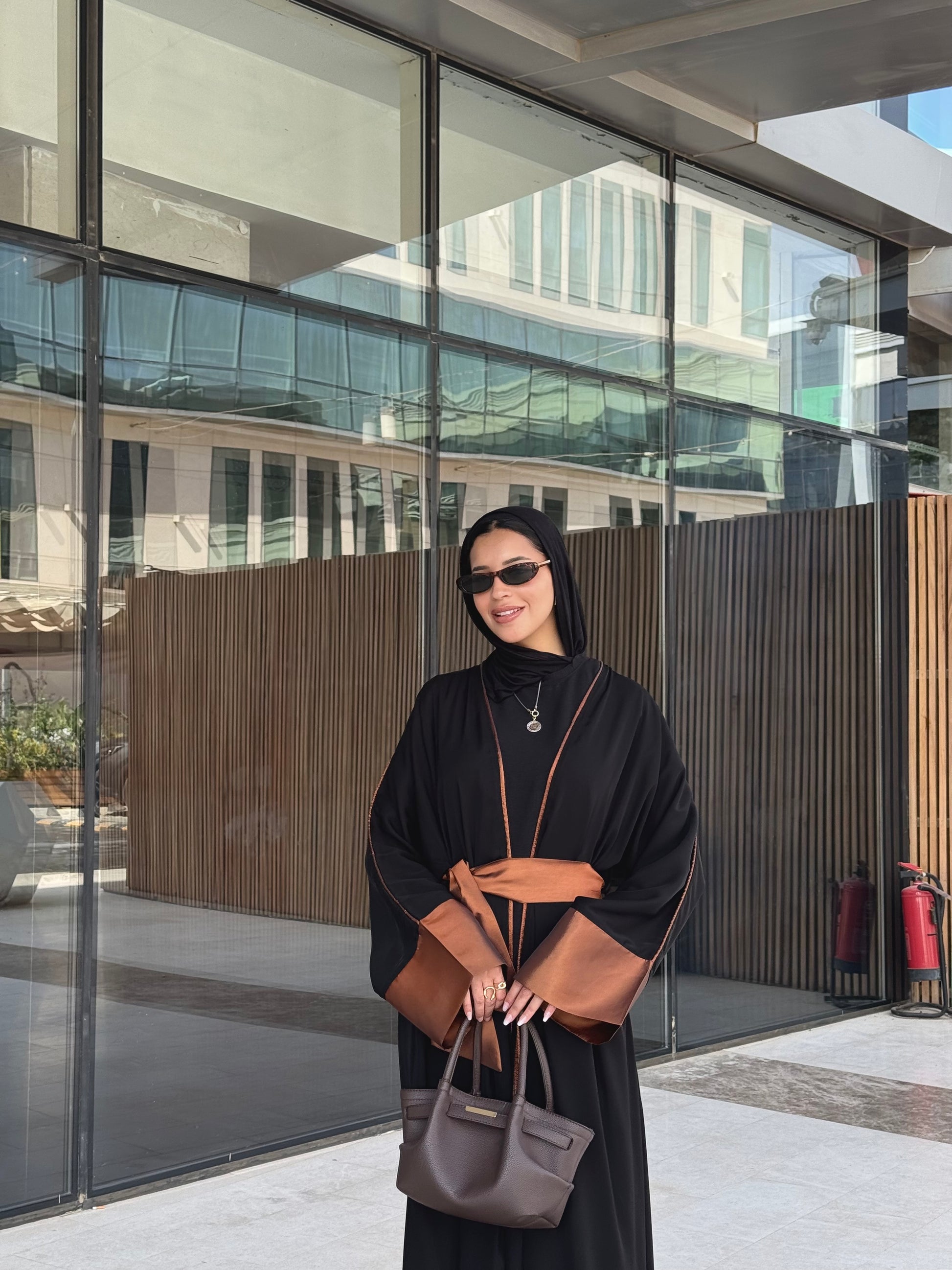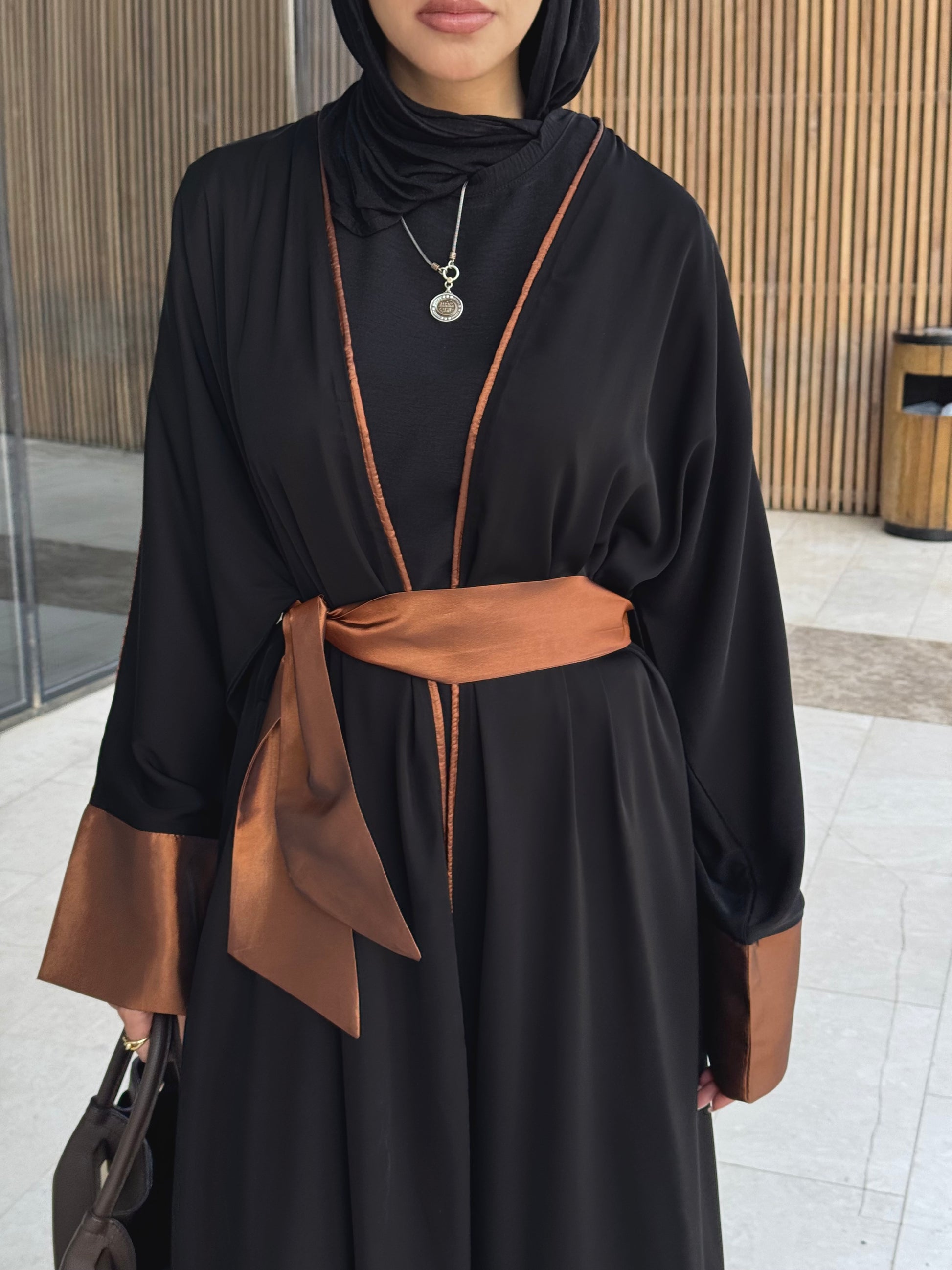 A timeless silhouette elevated with subtle bronze-toned sleeves. The Bronze Abaya blends classic black with a warm metallic accent, creating a quiet statement of strength and grace — perfect for special gatherings or elevated everyday wear.