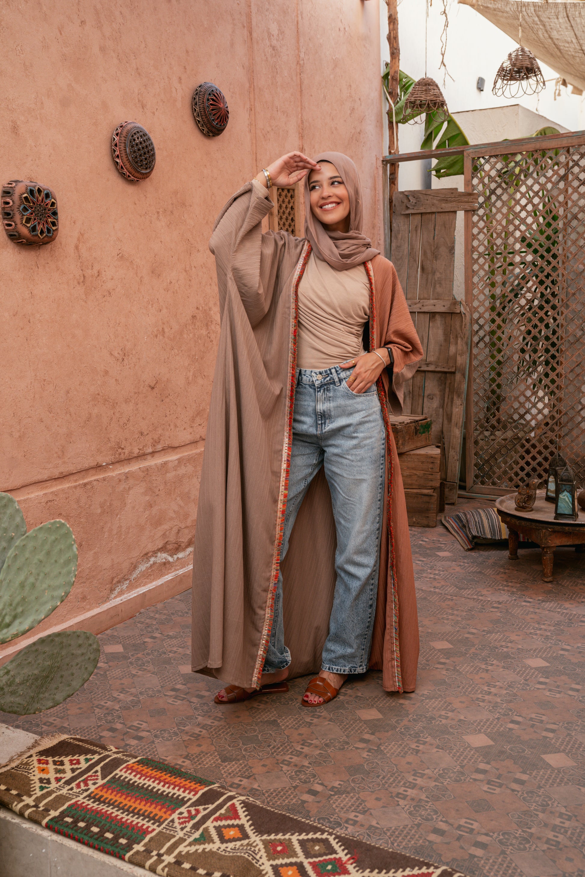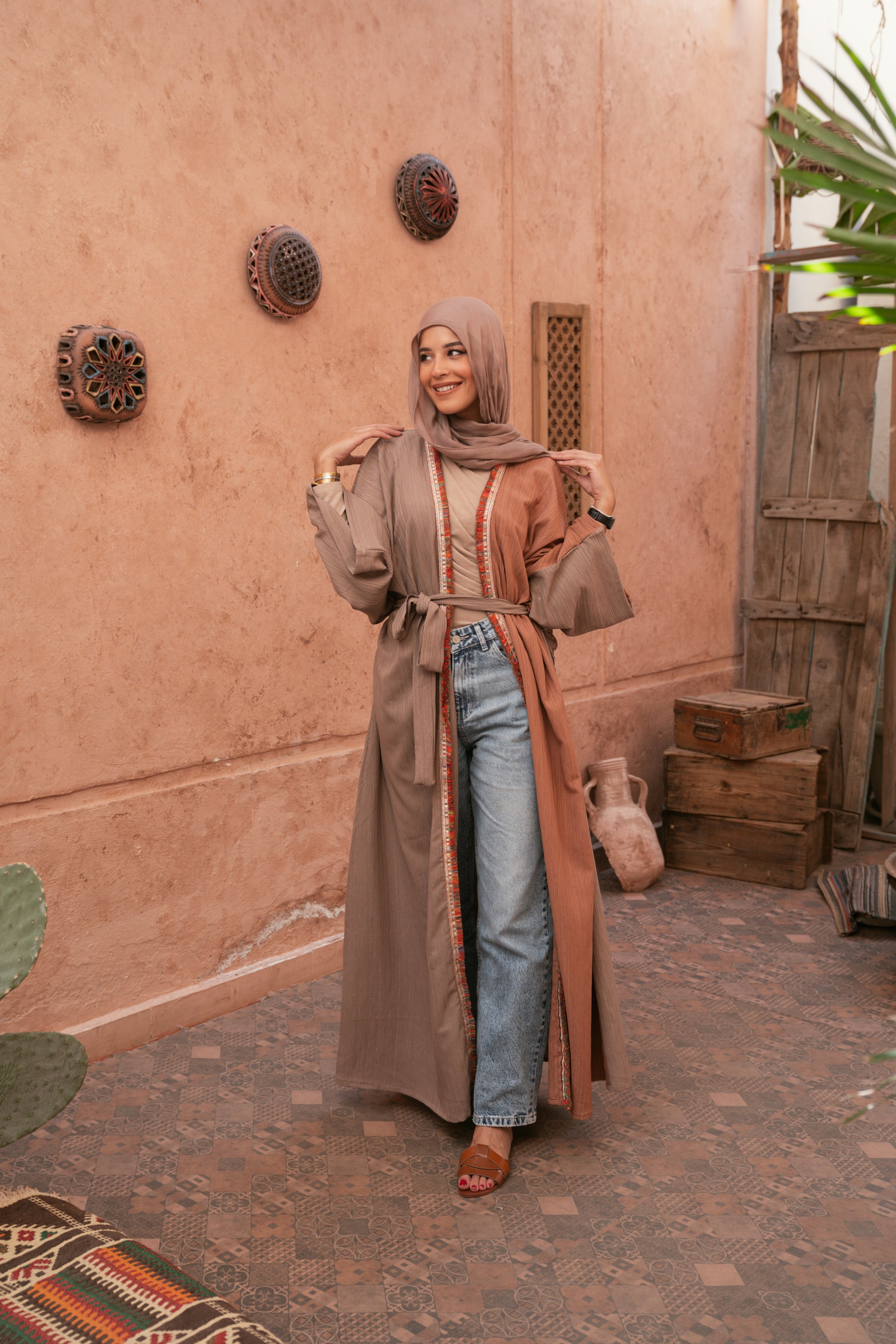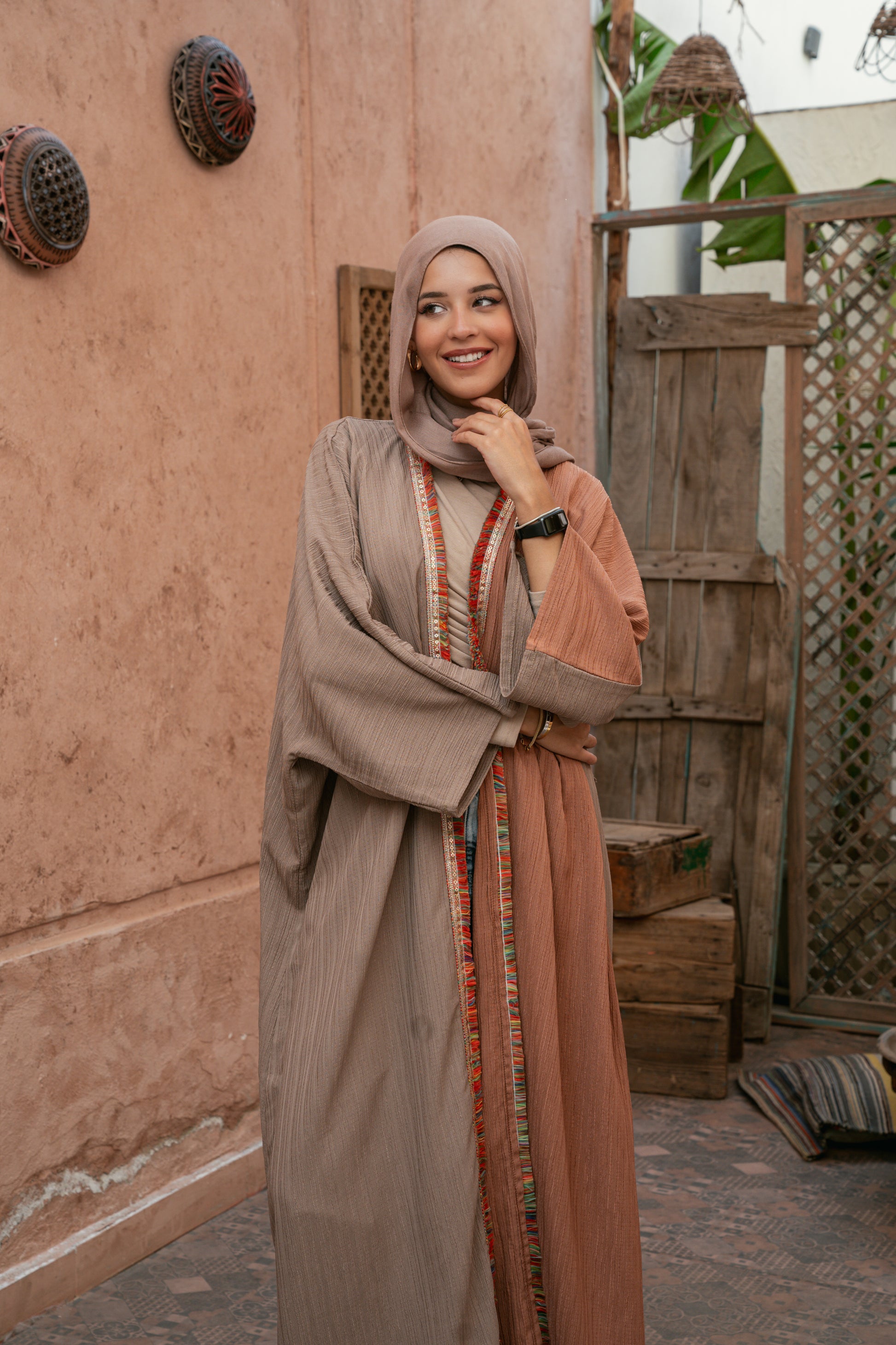 Embrace the serene essence of Ramadan with our Desert Earth Embroidered Kaftan. This elegant garment blends rich brown and soft camel tones, creating a warm, earthy base that reflects the tranquil desert landscape at sunset. The subtle yet exquisite embroidery, delicately stitched at the neckline and sleeve edges, enhances the kaftan’s graceful flow and adds a touch of traditional craftsmanship.