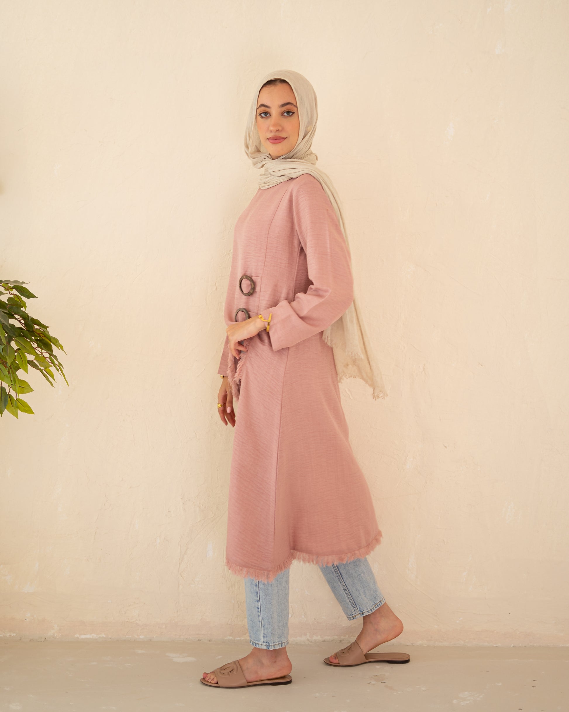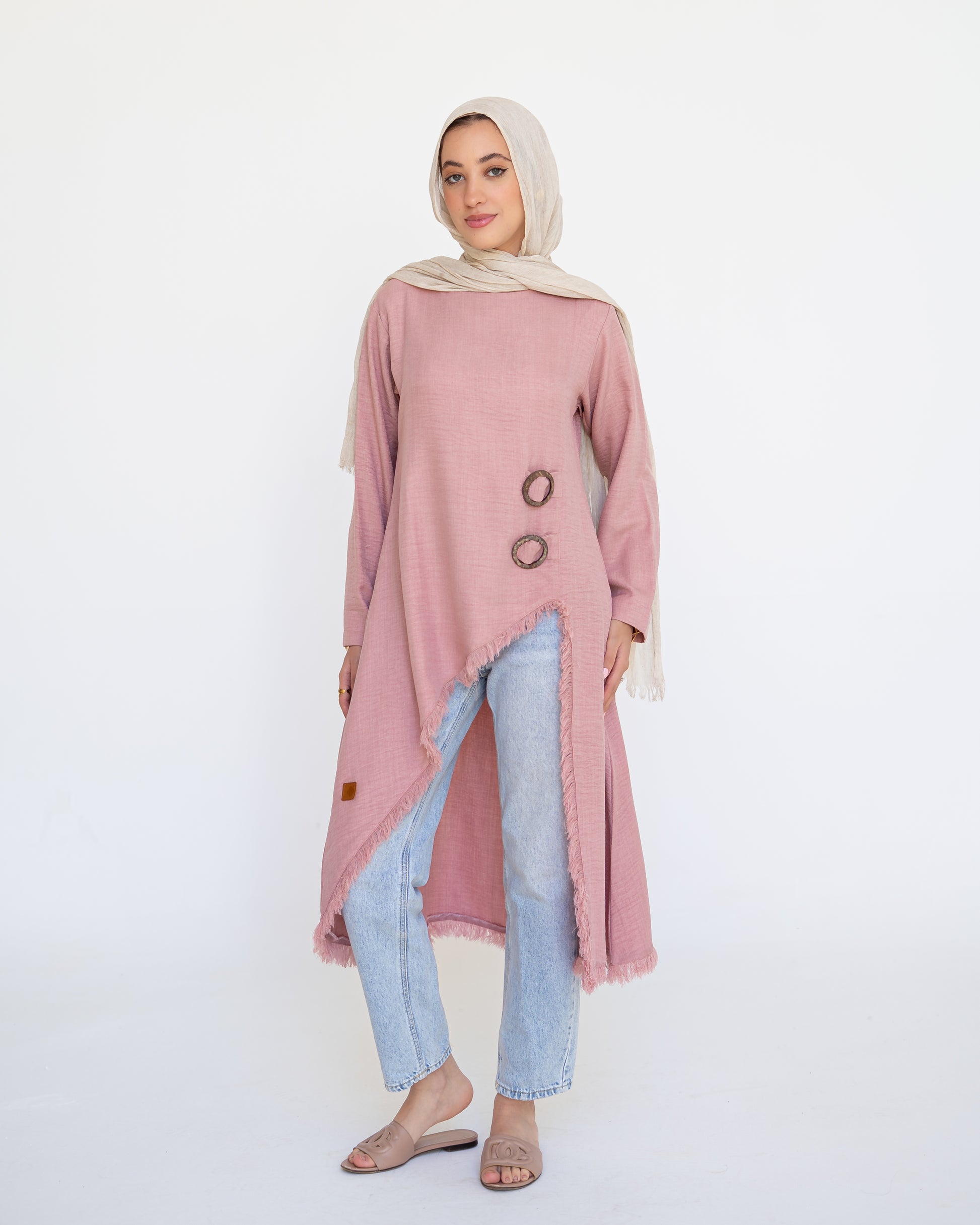 Elevate your everyday style with this effortlessly elegant linen top. Designed with a subtle front-side slit, soft fringed edges, and two decorative belts that add a flattering silhouette, this piece blends modesty with modern flair. Crafted from breathable linen and available in a range of earthy and vibrant tones, it’s the perfect go-to for light layering, timeless comfort, and versatile styling.