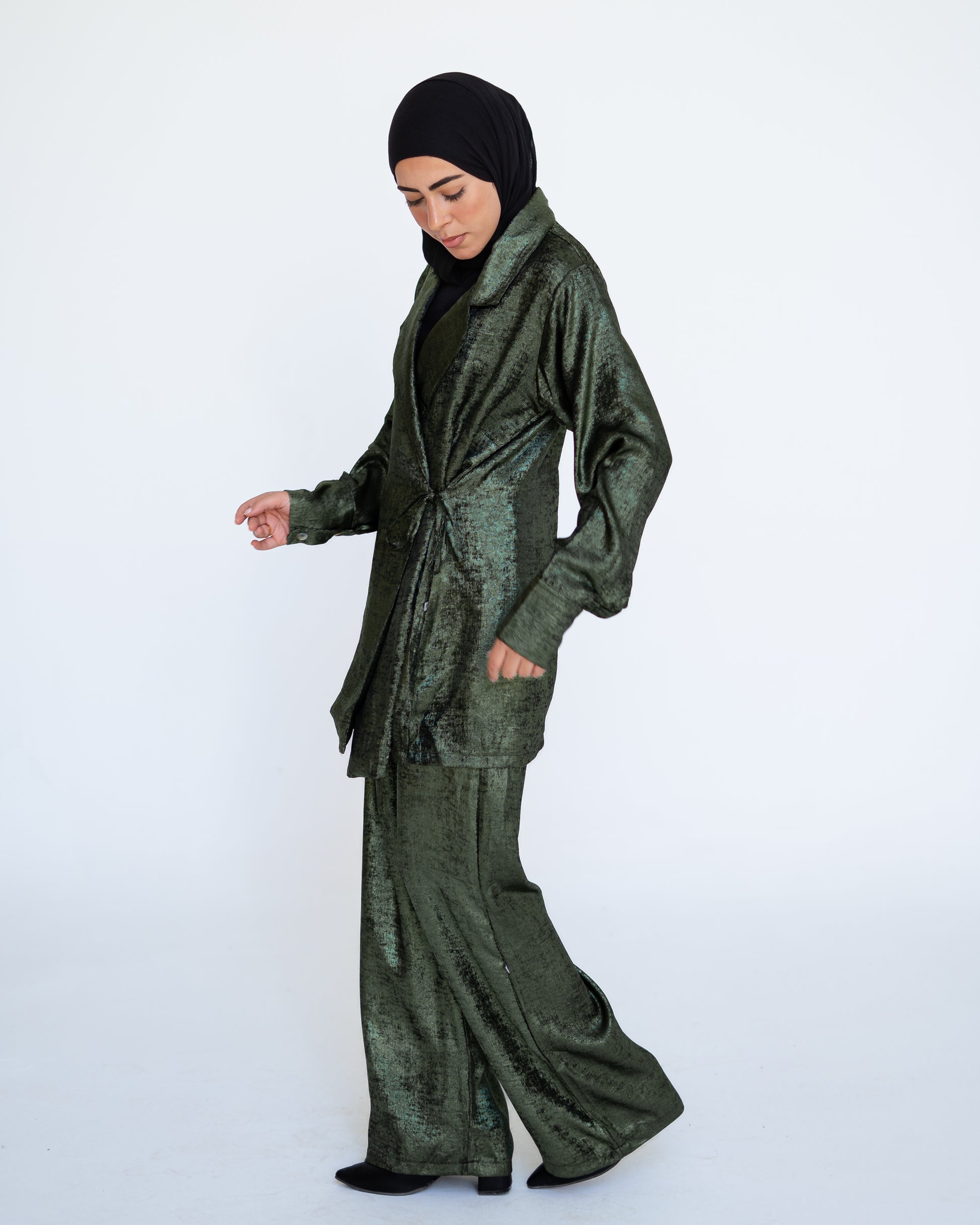The wrapped top drapes elegantly across the body, while straight pants ensure comfort and modest coverage. A refined choice for warm evenings and sophisticated styling.