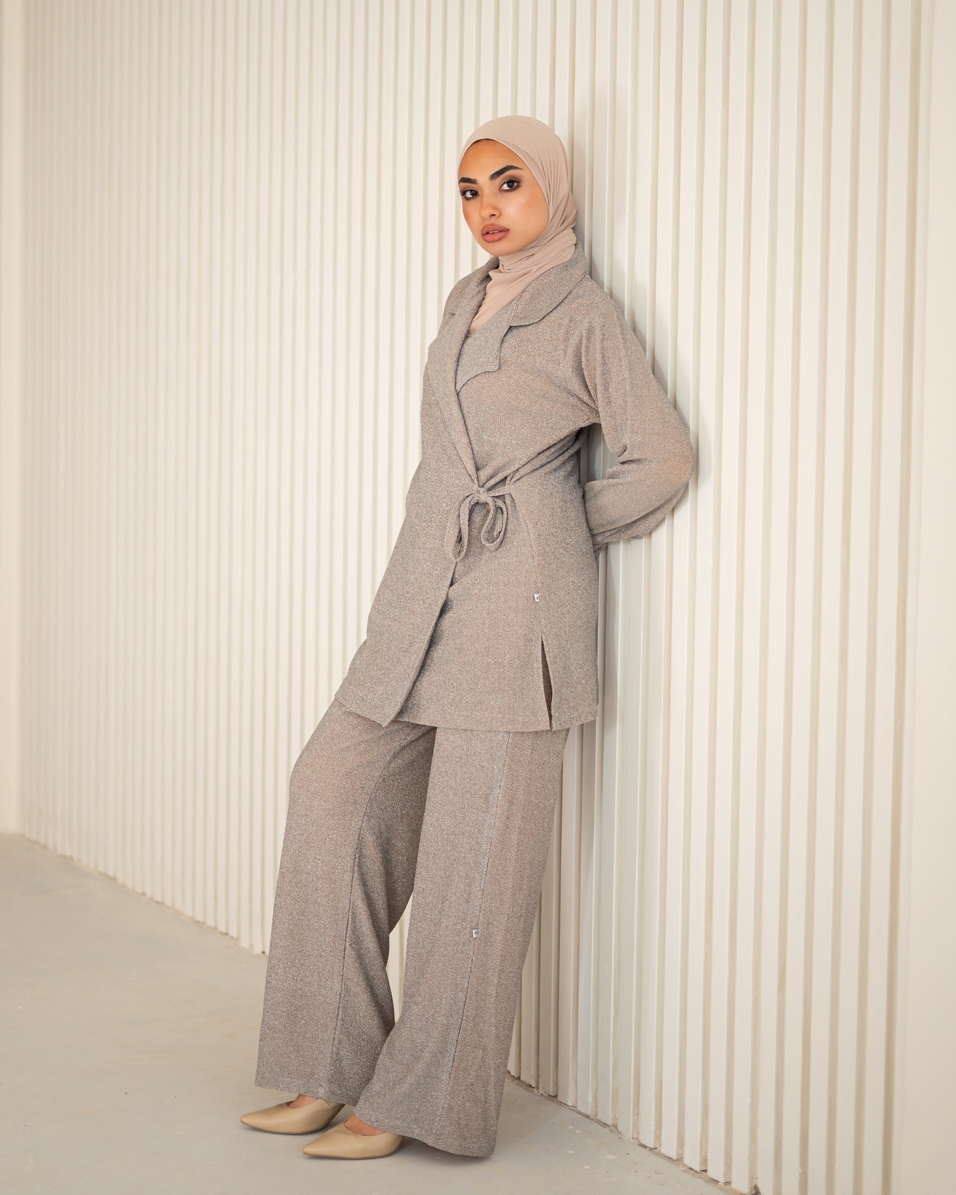 The beige Glow Reflective Set features a softly shimmering elastic fabric that provides comfort, flexibility, and a flattering drape — ideal for a polished, modest look from day to night.
