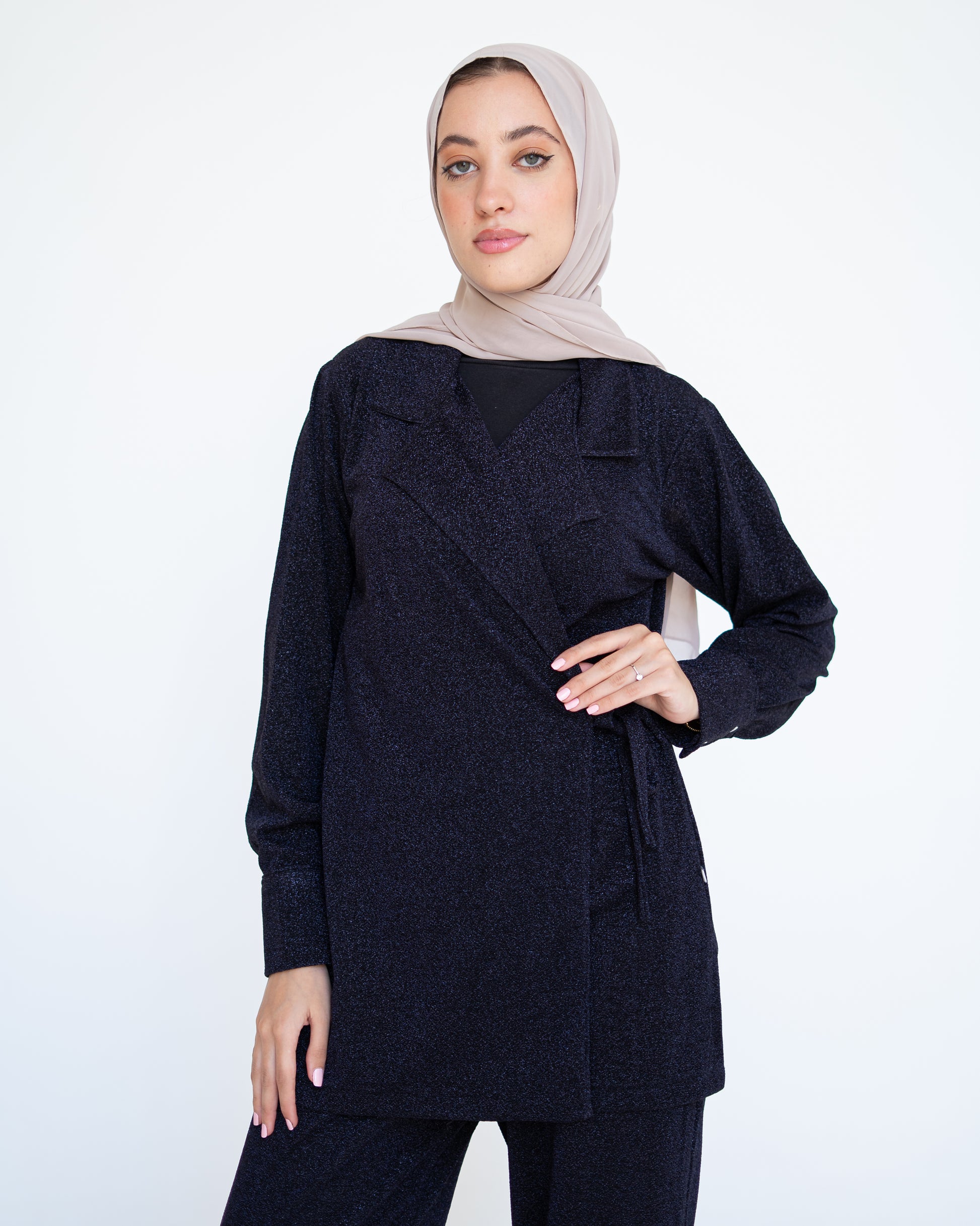 A deep navy shade crafted in an elastic shimmery fabric that moves with the body.