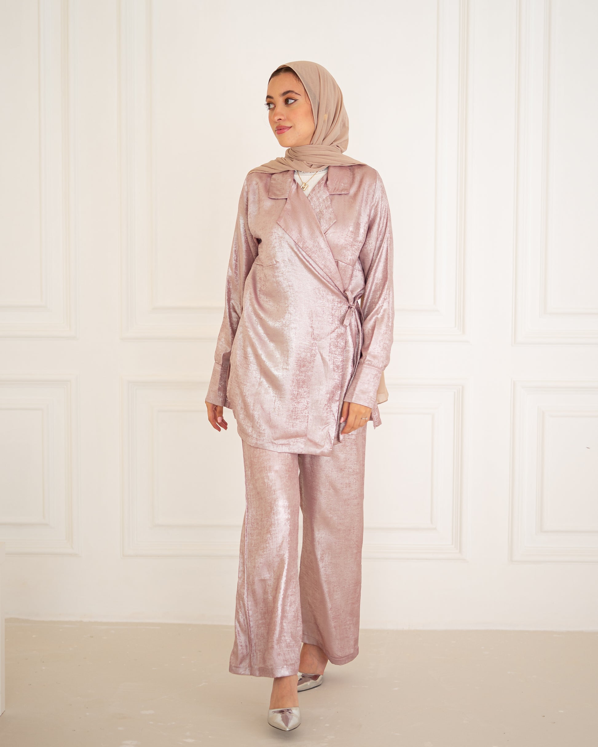 The wrap design enhances softness and movement, while the straight pants maintain structure and balance.