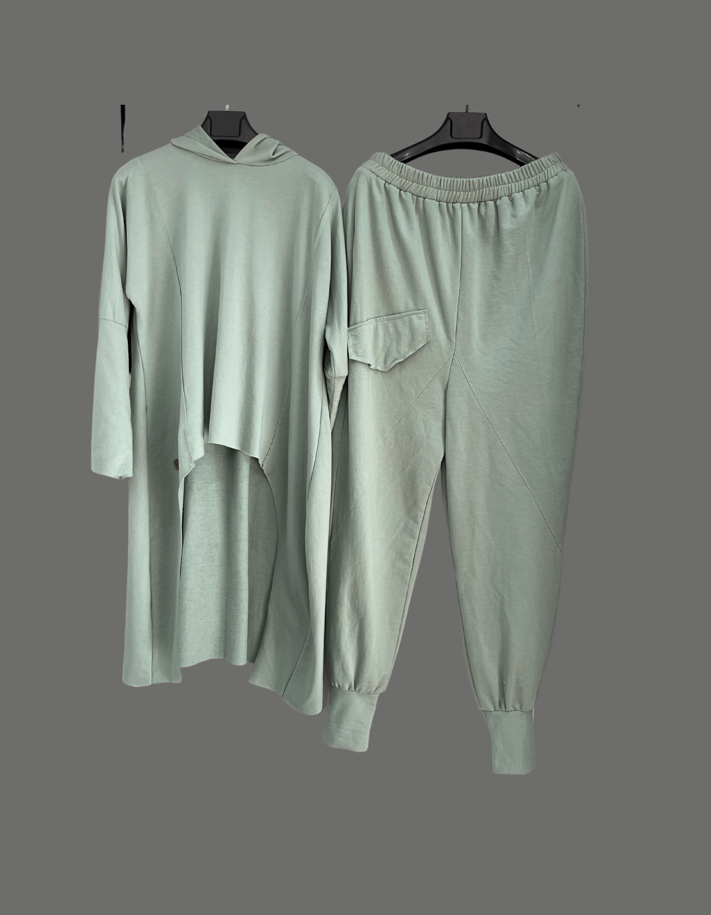 Enjoy this comfy warm set, featuring a high low top and joggers. Two in one for easy wearability,