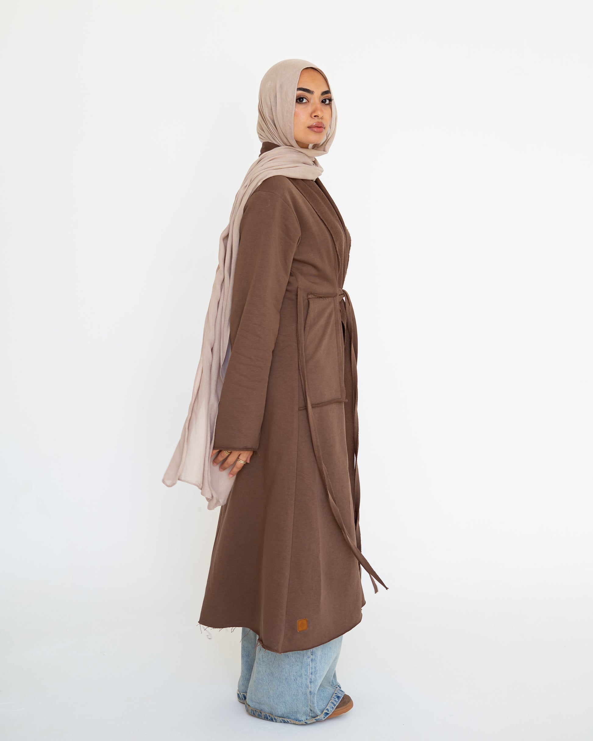 Our Fringes Flow Cardigan in Mocha is crafted from a soft, padded winter fabric that delivers warmth while maintaining a beautiful, fluid drape. The long, modest silhouette creates effortless movement, and the smooth mocha tone brings a touch of natural, understated sophistication to your wardrobe.