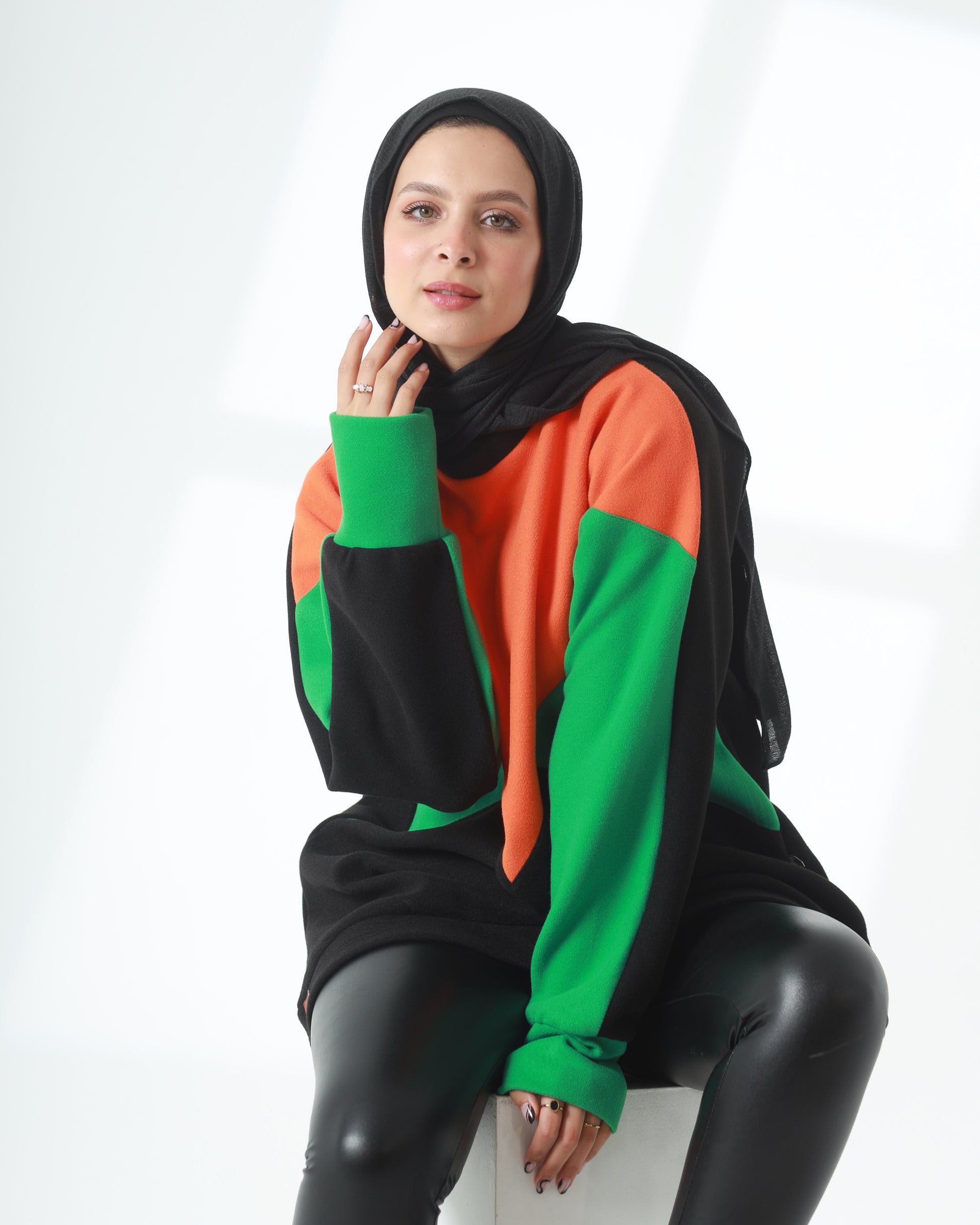 When it comes to comfort and style, this chic oversized sweatshirt is a perfect addition to your winterr wardrobe. It's made of high quality colored washable wool fibers, with a black, green and orange.