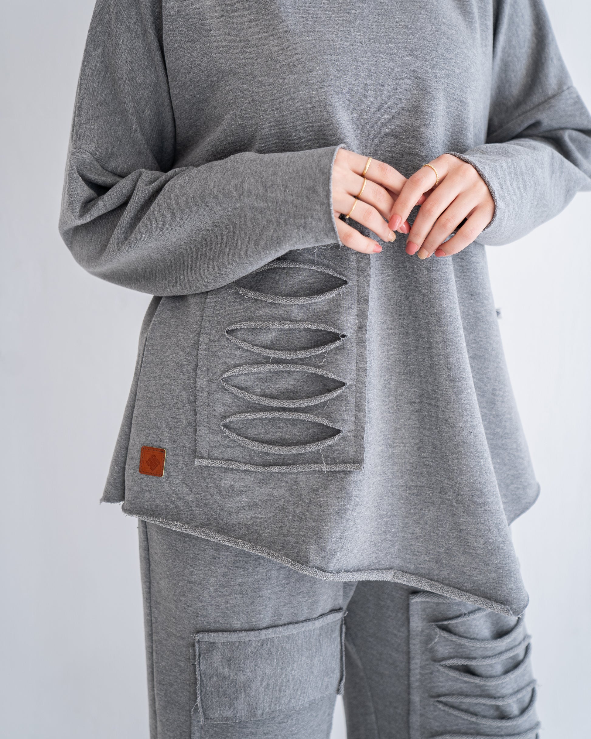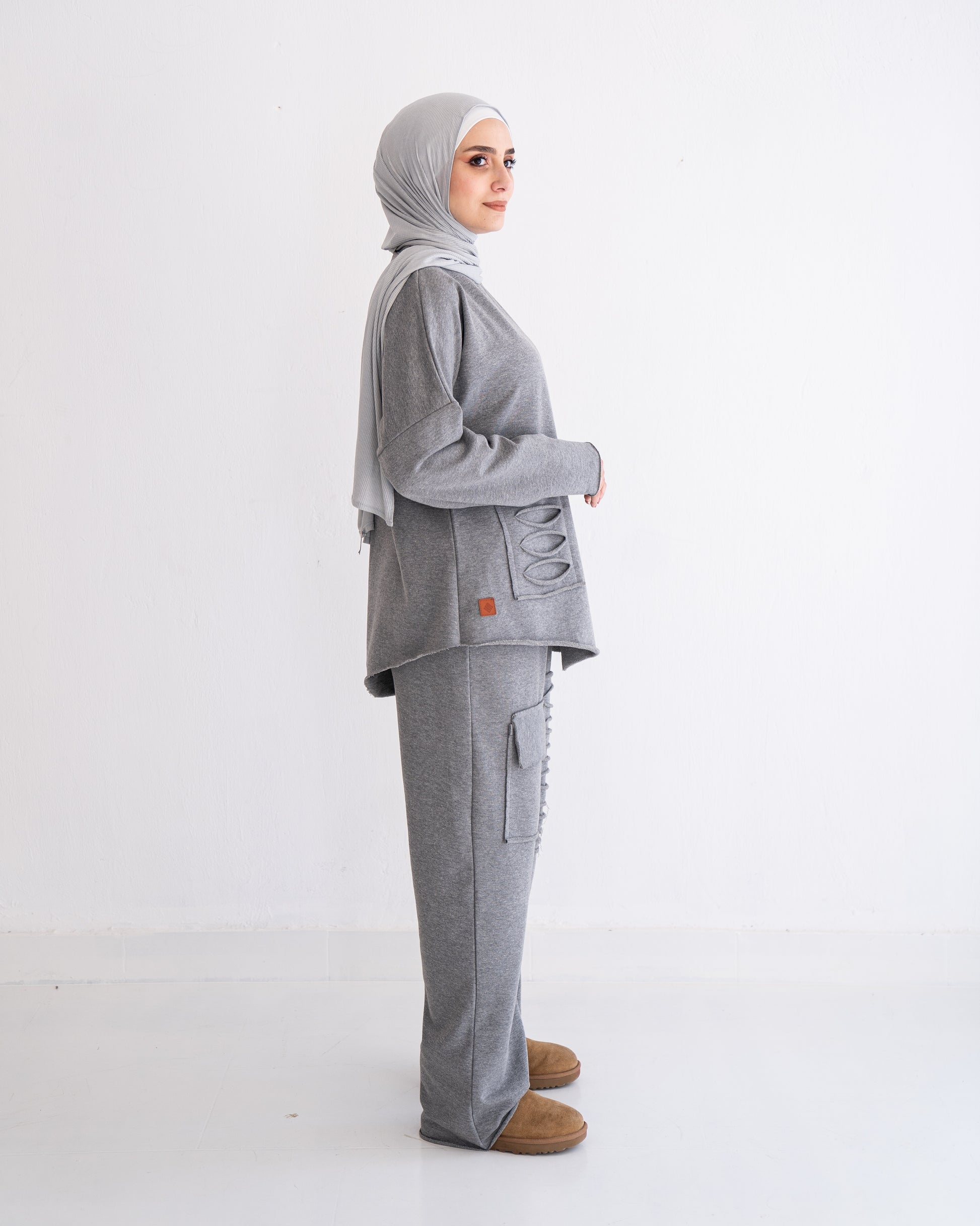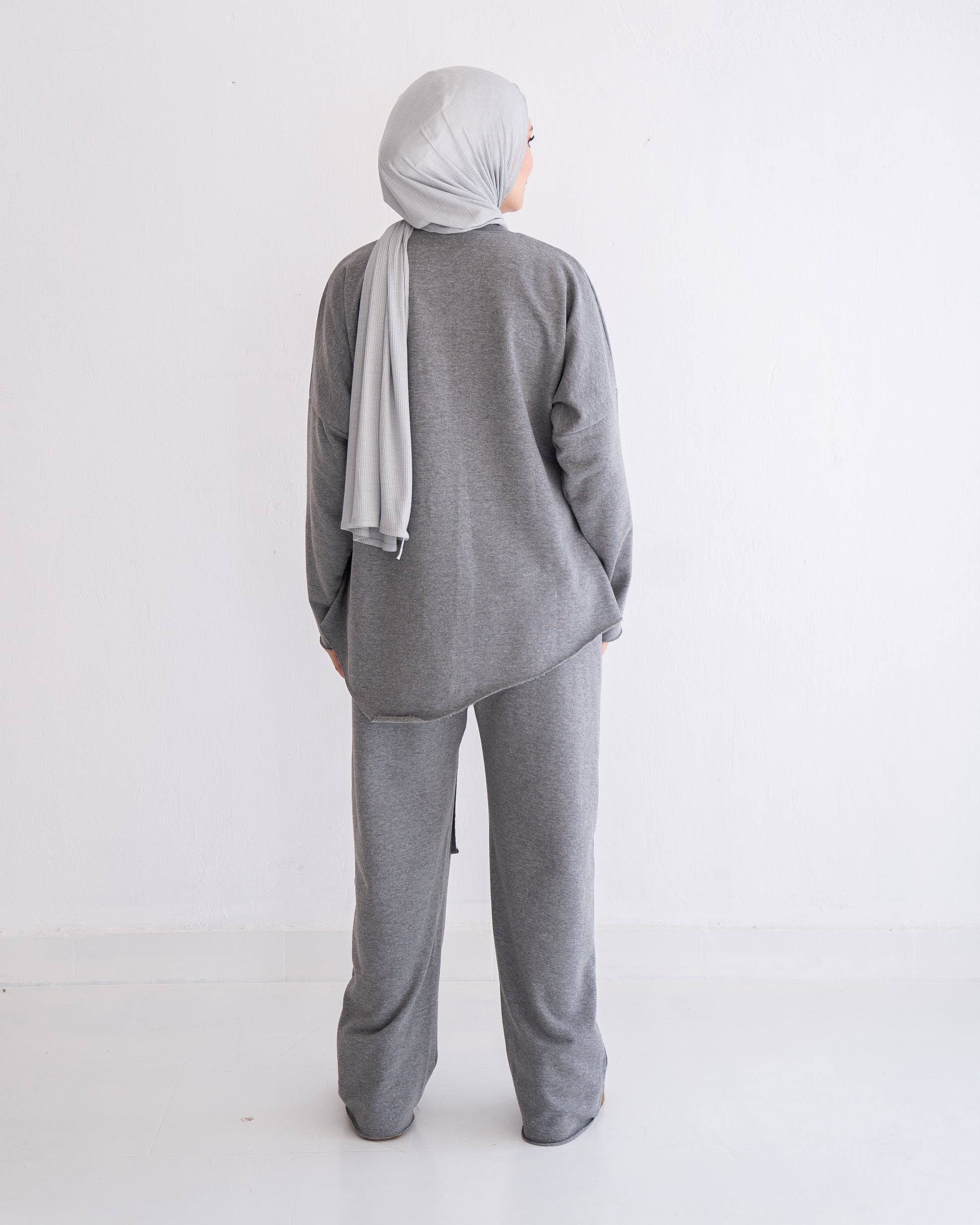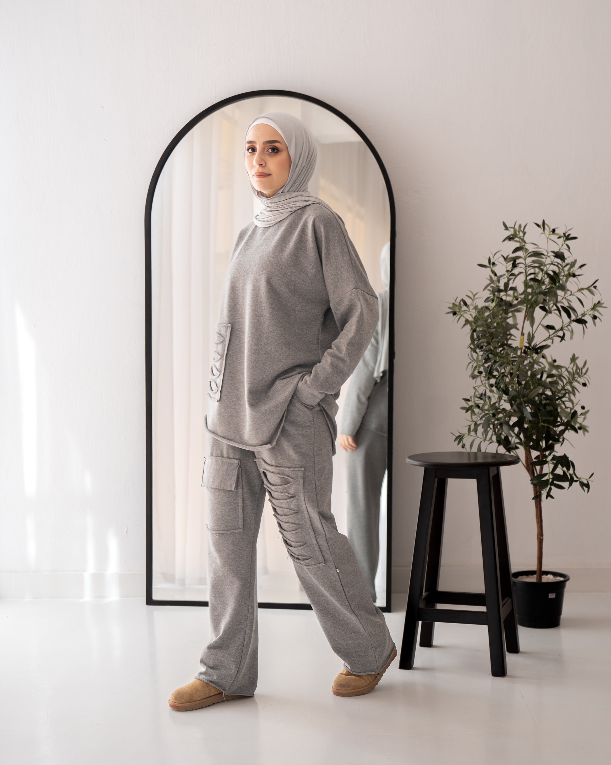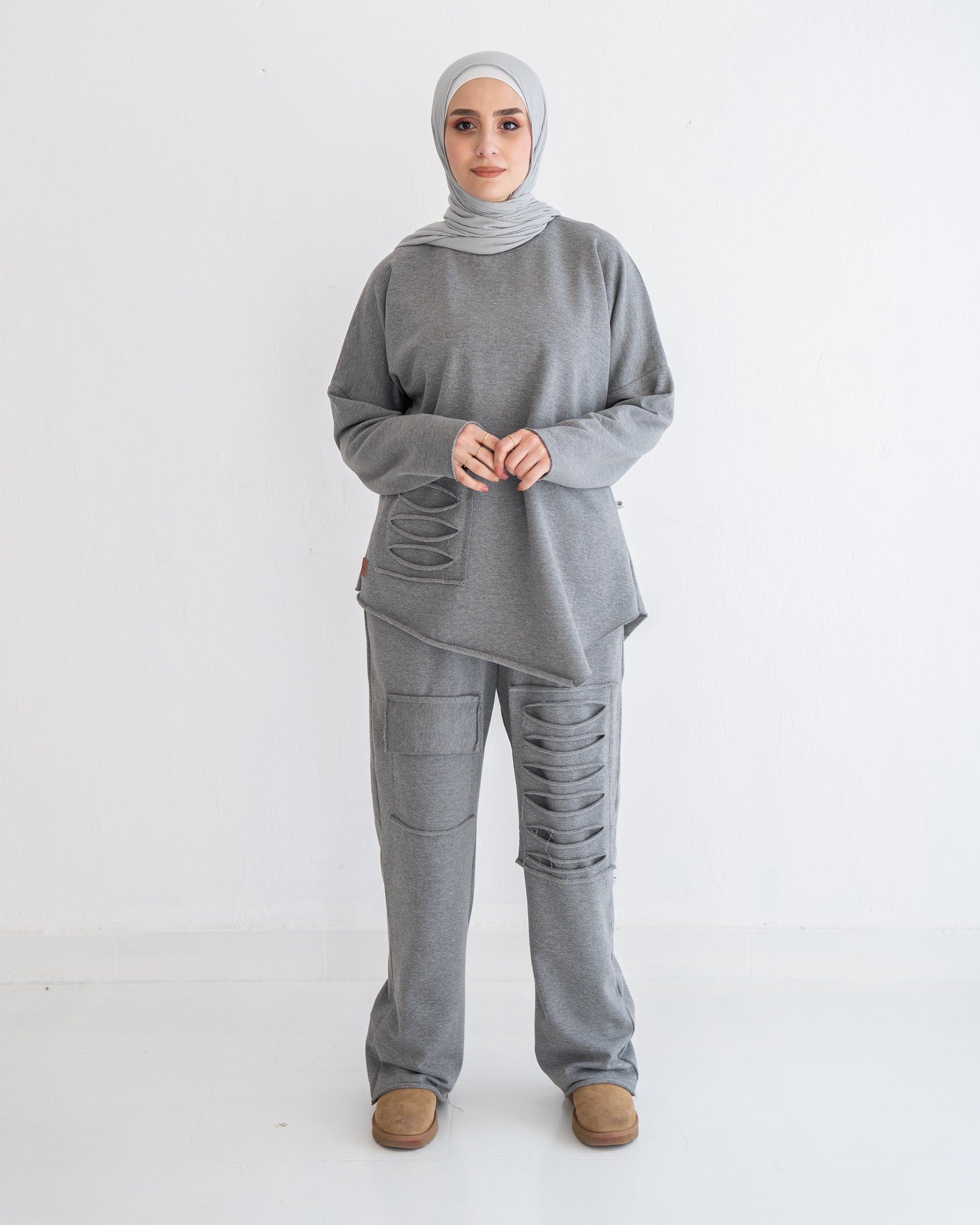 The Rsquared Ripped Set, a daring yet modest ensemble, designed for the contemporary woman who values both modesty and modernity in her wardrobe. The beautifully designed top takes casual comfort to the next level, incorporating a modern ripped style.The matching pants extend the theme of modest modernity with carefully placed ripped accents. The design merges traditional modesty with an edge of contemporary style, making a statement without saying a word. Engineered for comfort, the pants feature an elastic waistband, ensuring a snug and secure fit while emphasizing ease of movement. The fabric's quality promises longevity and resilience, making it a staple addition to your wardrobe.