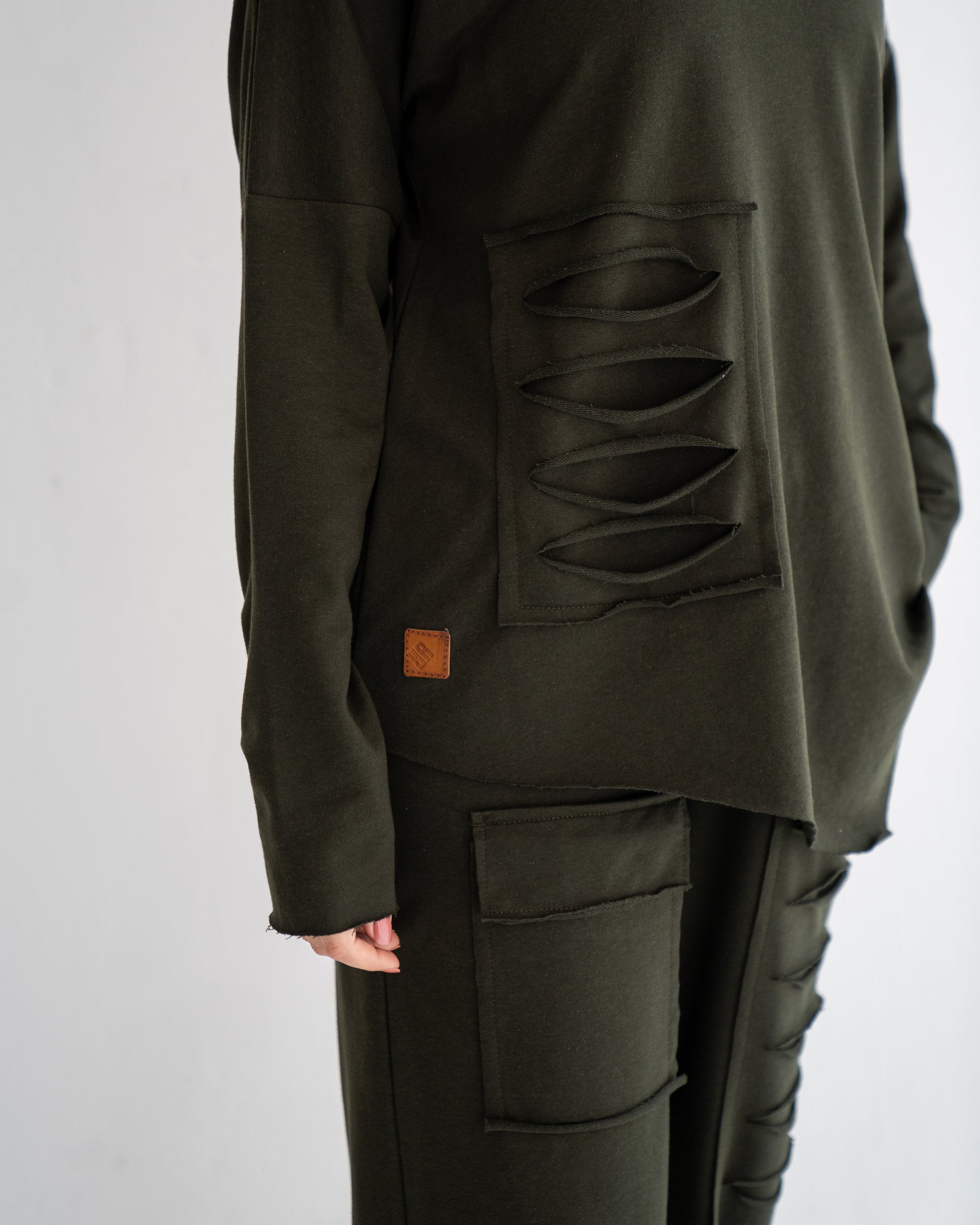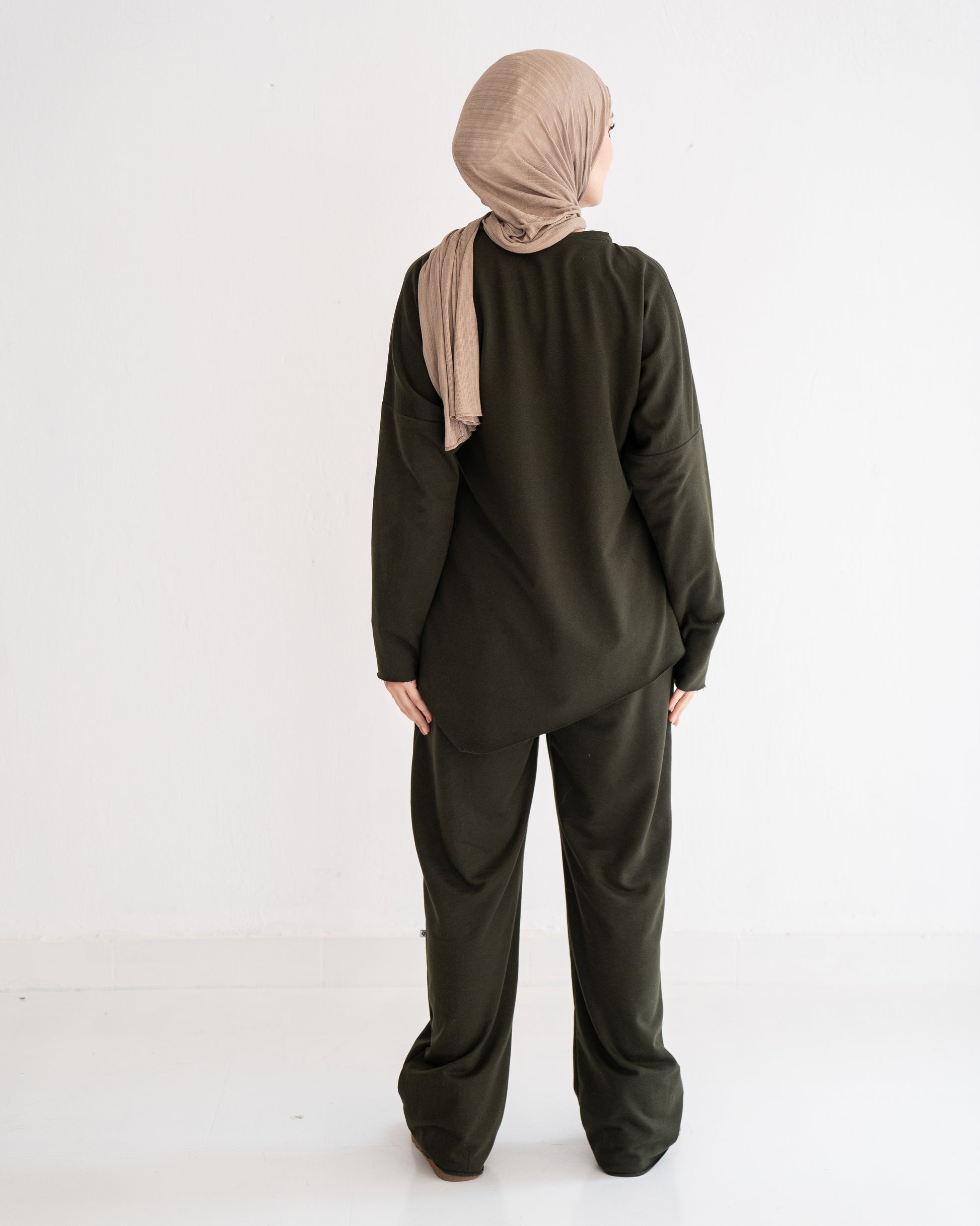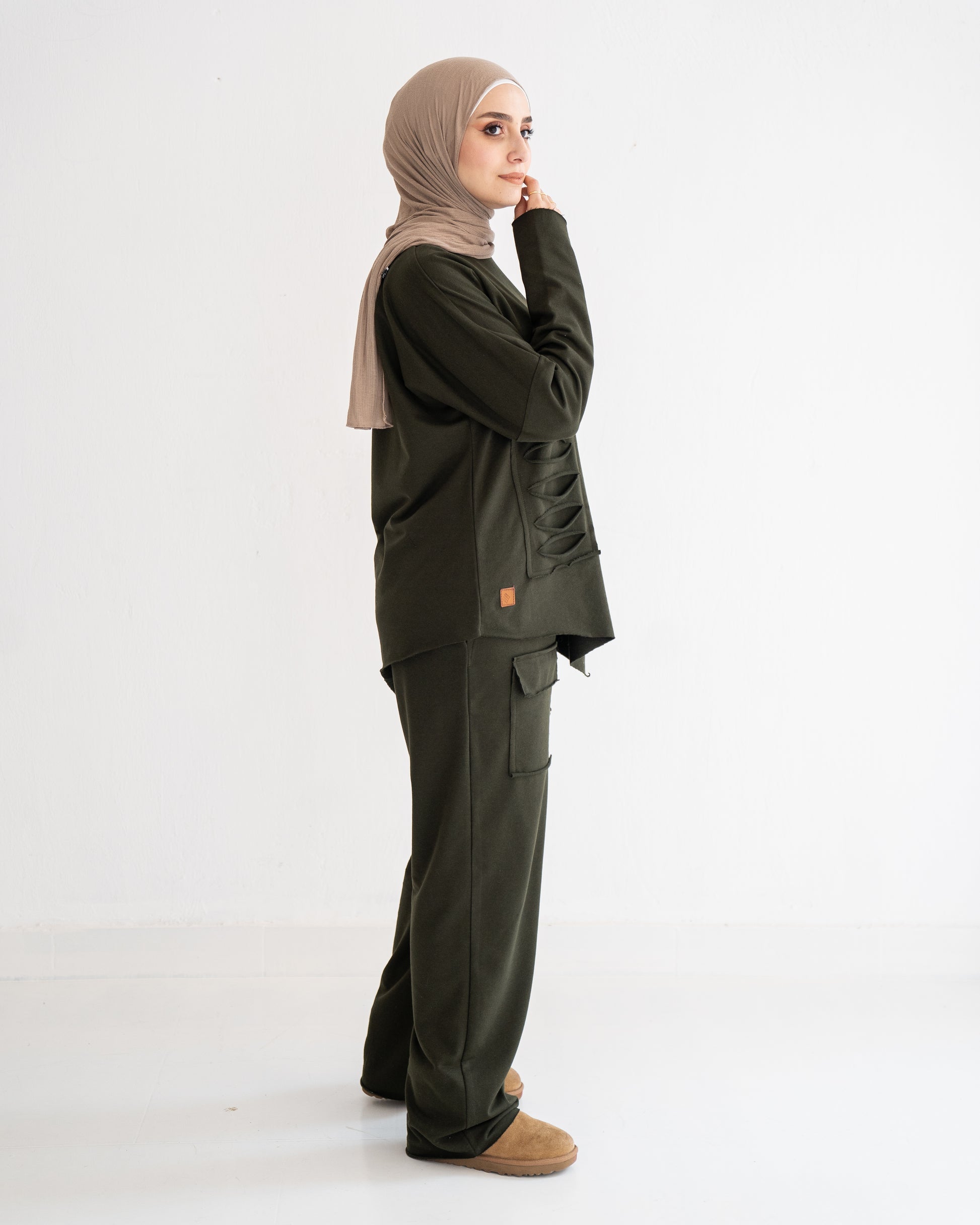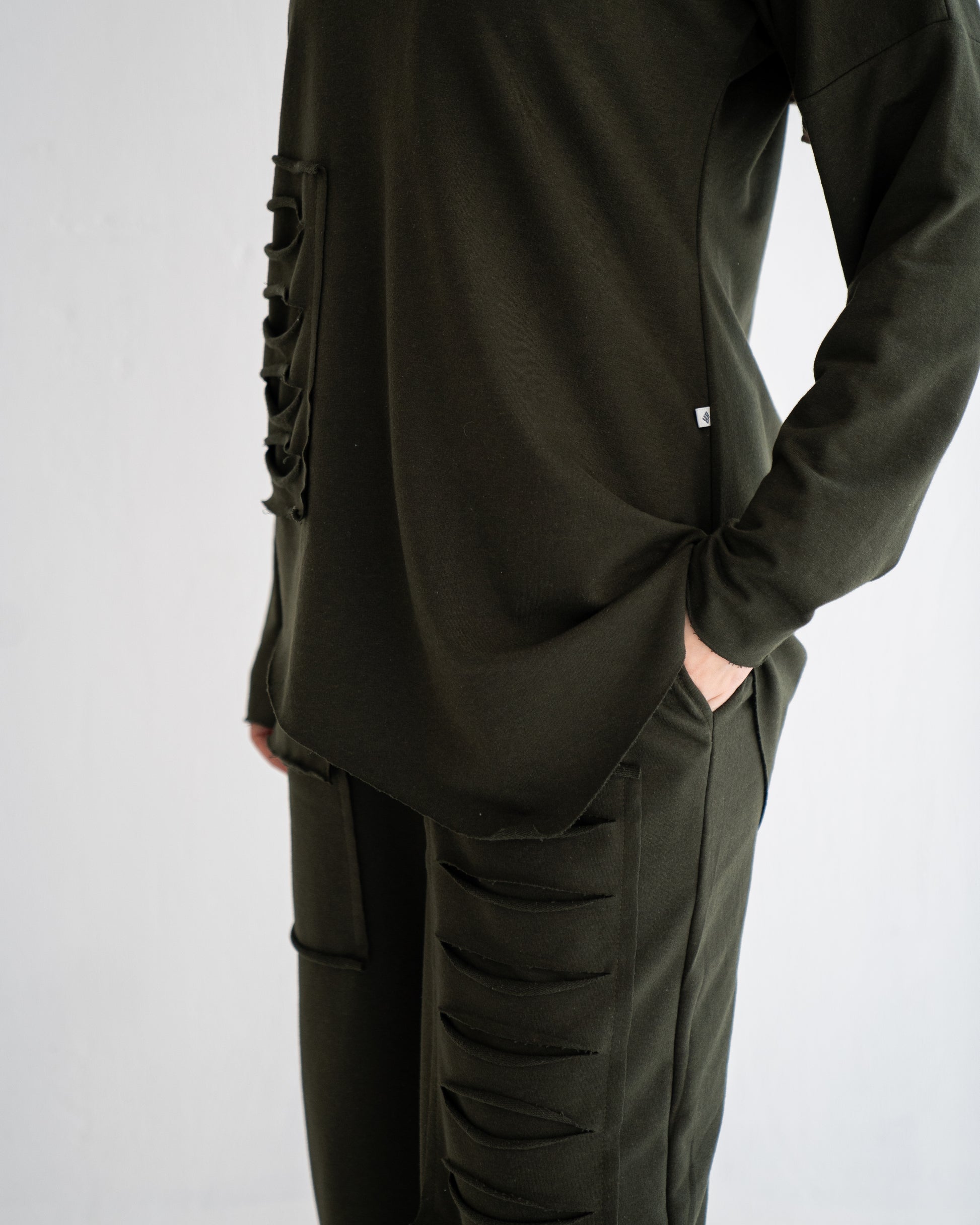 The Rsquared Ripped Set, a daring yet modest ensemble, designed for the contemporary woman who values both modesty and modernity in her wardrobe. The beautifully designed top takes casual comfort to the next level, incorporating a modern ripped style.The matching pants extend the theme of modest modernity with carefully placed ripped accents. The design merges traditional modesty with an edge of contemporary style, making a statement without saying a word. Engineered for comfort, the pants feature an elastic waistband, ensuring a snug and secure fit while emphasizing ease of movement. The fabric's quality promises longevity and resilience, making it a staple addition to your wardrobe.