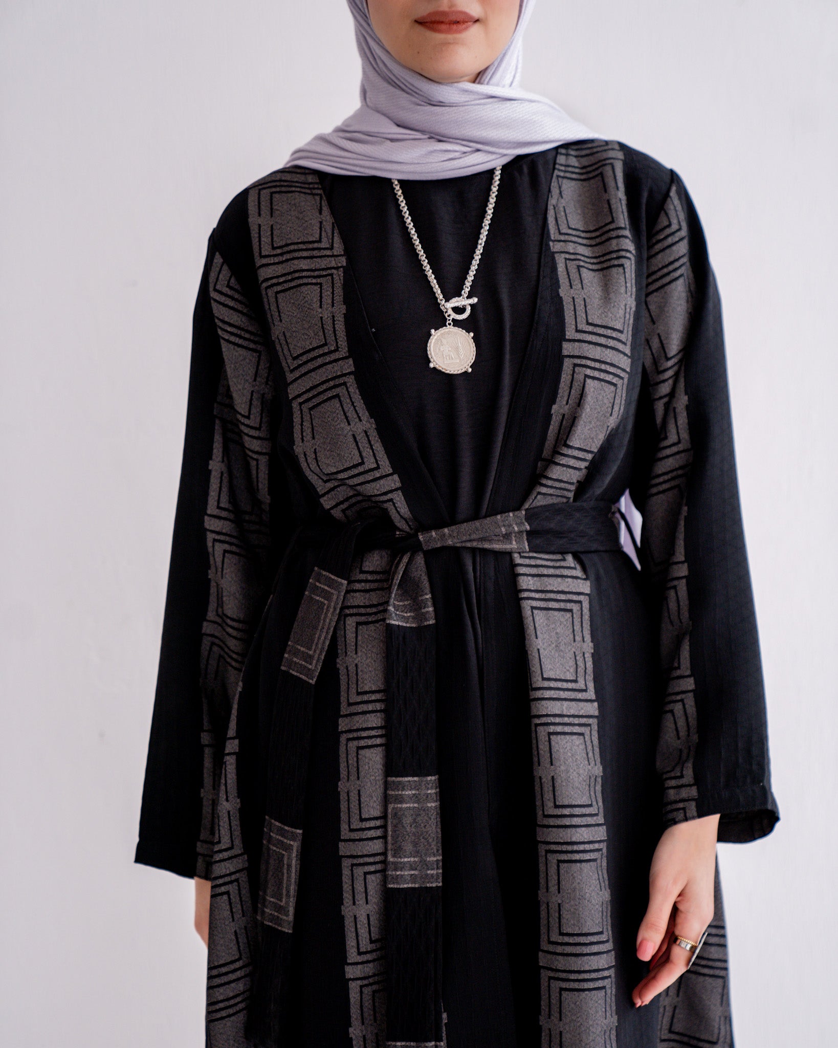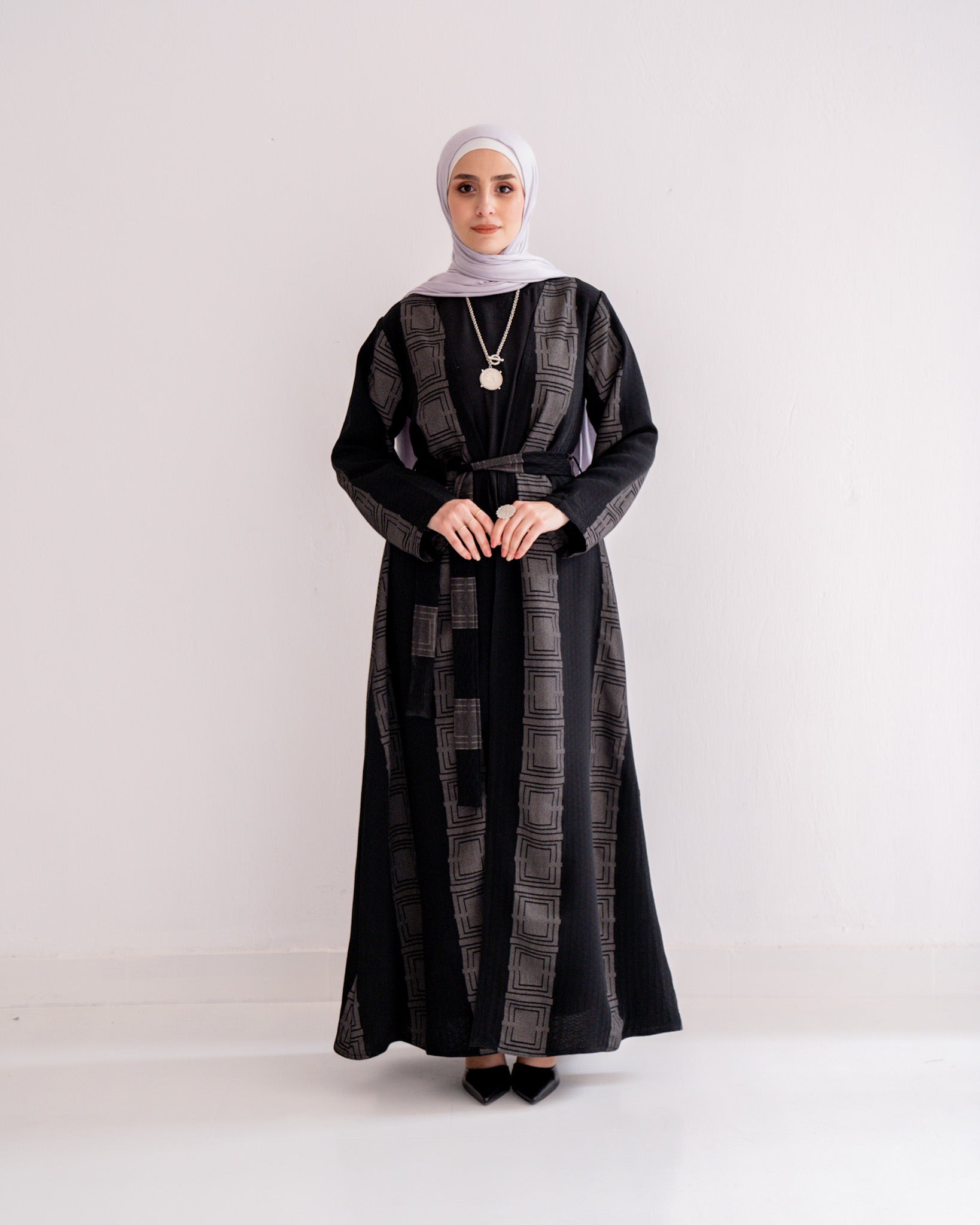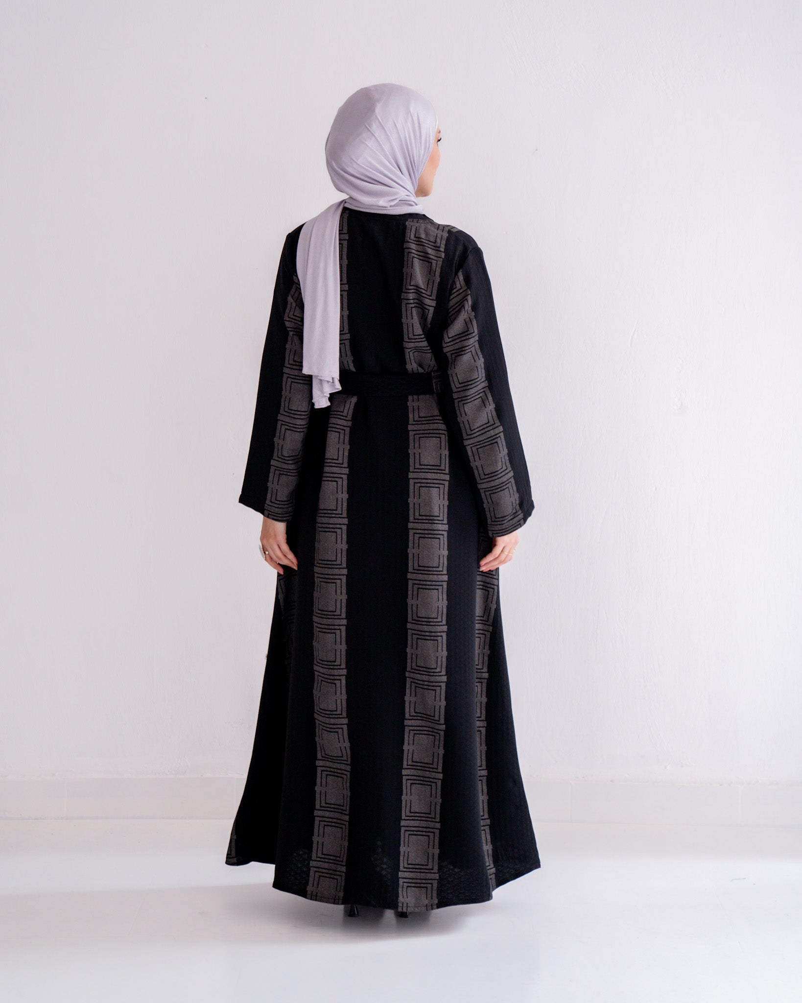 Crafted with premium quality fabric, the abaya promises a luxurious feel that drapes elegantly over the silhouette, offering both comfort and style. With a smooth, soft-touch finish, it signifies high durability and longevity, ensuring that the garment remains a cherished part of your wardrobe for Ramadans to come. A defining feature of the abaya is the intricate grey Arabic pattern that travels subtly across the garment. The pattern is an artistic tribute to our rich heritage and culture. It adds a textural visual interest that is appealing but not overpowering, maintaining the piece's resonant modesty.