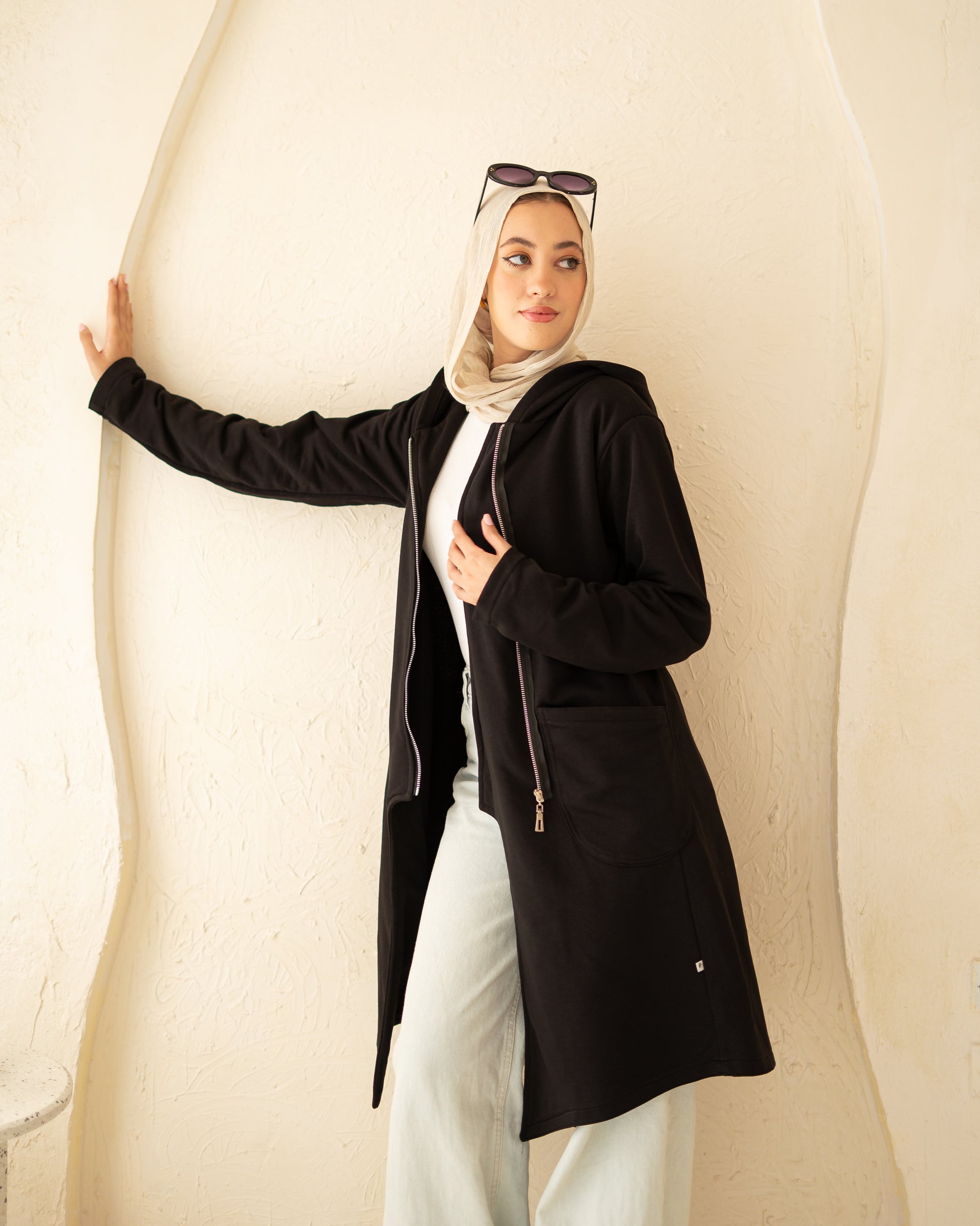 Timeless, sleek, and grounding. A soft-flow cardigan with pockets, offering effortless layering and a touch of quiet sophistication.