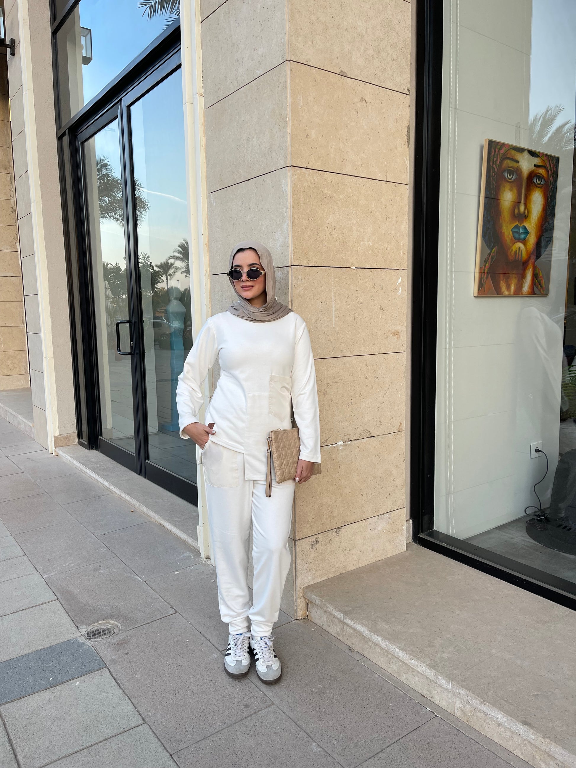 Dive in sportswear excellence, designed meticulously for the modern woman who doesn’t compromise on style or functionality. Each set features a high-neck top that redefines elegance with its waterproof pocket – a nod to practicality for the on-the-go individual. With a bold, squared cut that varies in length, this ensemble offers a contemporary silhouette that is both flattering and unique. Paired with sleek joggers, each set is available in three carefully selected colors: the serene Off White, the refreshing Mint, and the classic Black with a vibrant blue accent. The AquaZenith Ensemble brings together comfort, function, and fashion in perfect harmony.