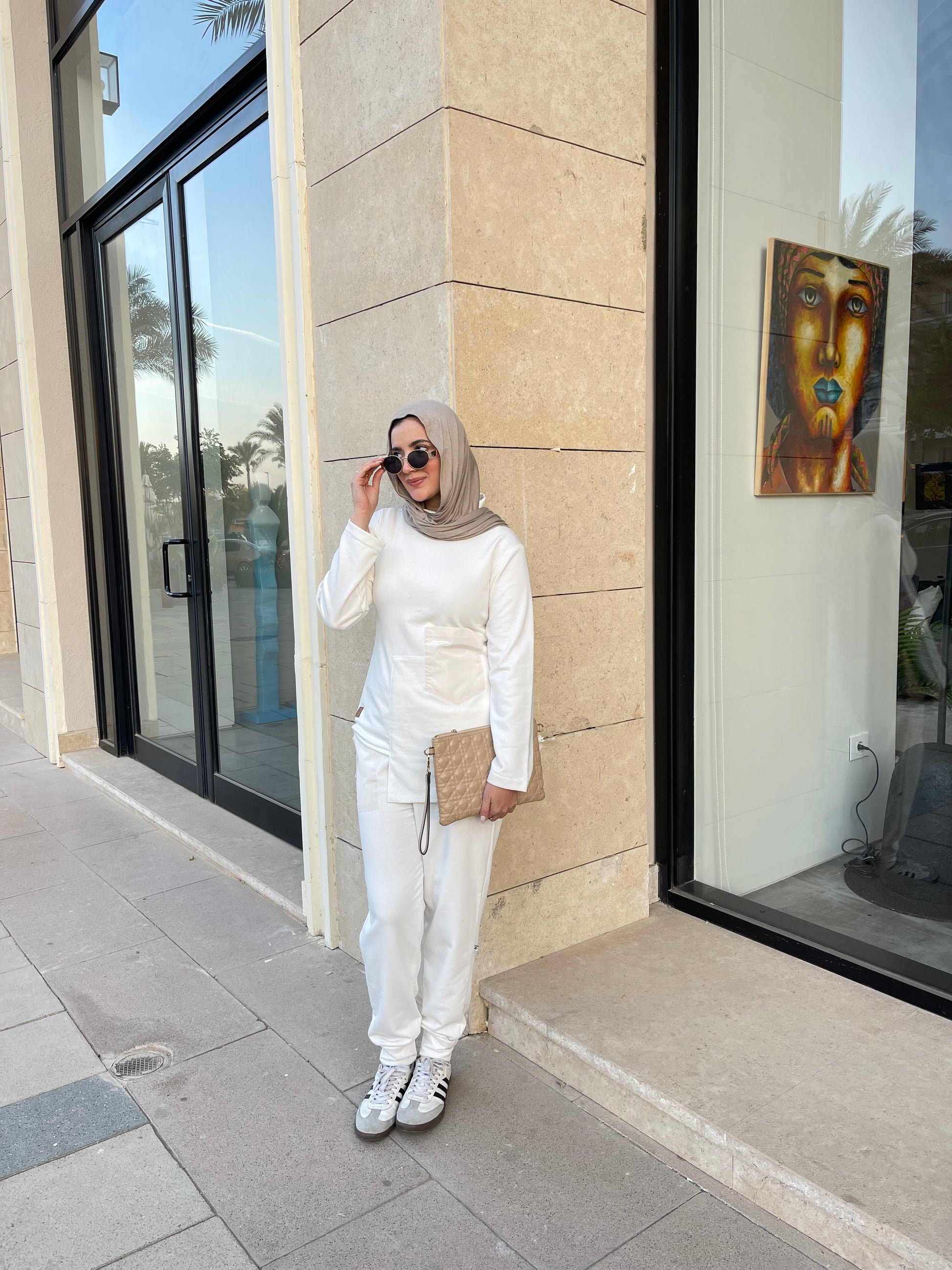 Dive in sportswear excellence, designed meticulously for the modern woman who doesn’t compromise on style or functionality. Each set features a high-neck top that redefines elegance with its waterproof pocket – a nod to practicality for the on-the-go individual. With a bold, squared cut that varies in length, this ensemble offers a contemporary silhouette that is both flattering and unique. Paired with sleek joggers, each set is available in three carefully selected colors: the serene Off White, the refreshing Mint, and the classic Black with a vibrant blue accent. The AquaZenith Ensemble brings together comfort, function, and fashion in perfect harmony.