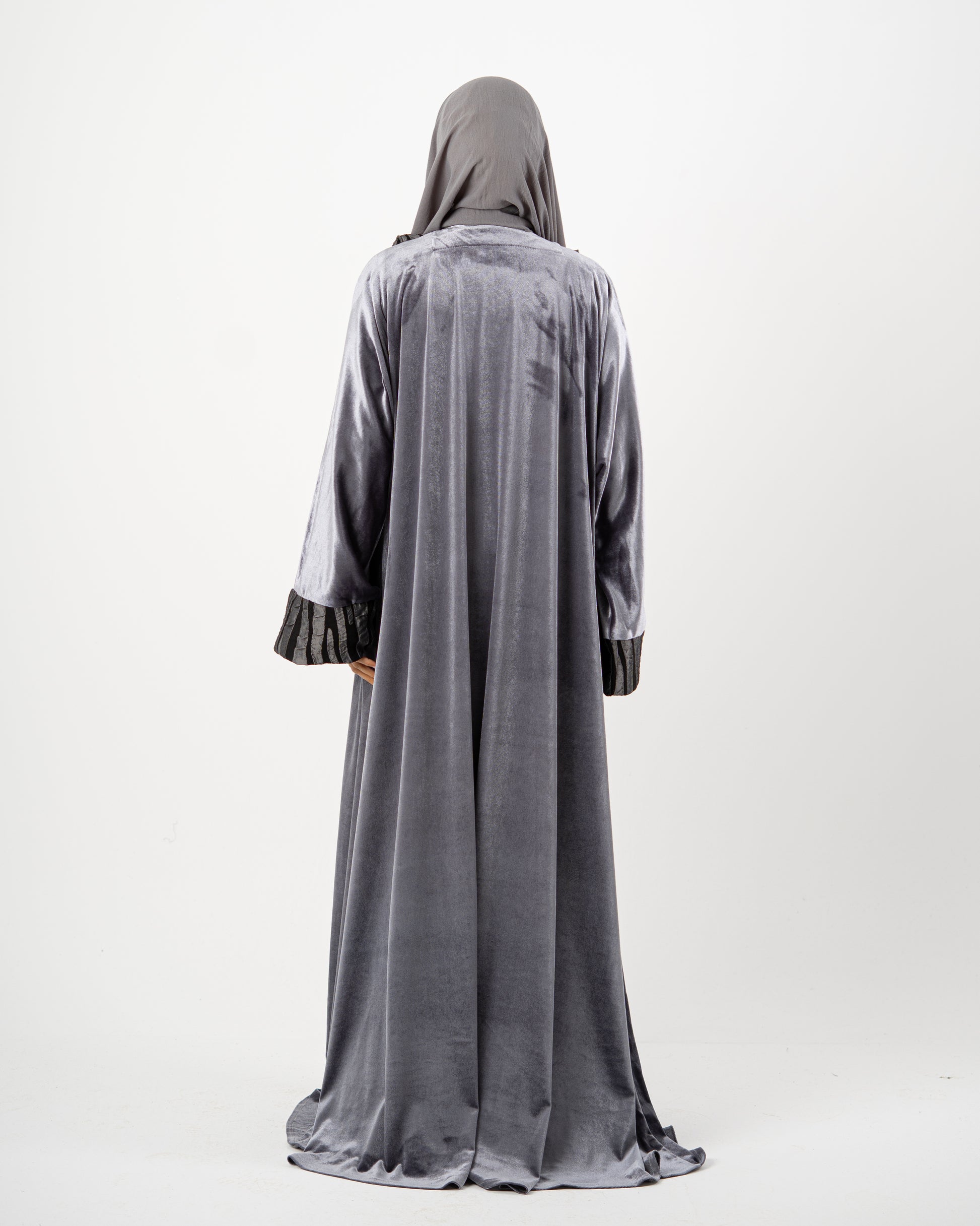Crafted from smooth velvet fabric, this abaya features striped detailing along the front and sleeves, adding depth and visual interest while keeping the overall look refined. The open-front design allows for easy styling over inner dresses or sets.