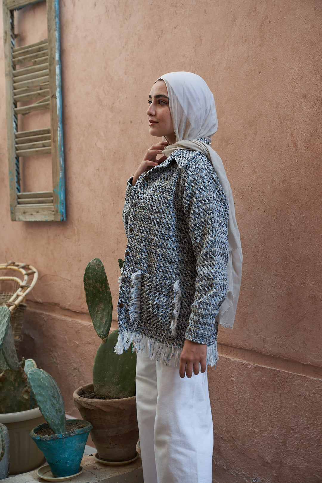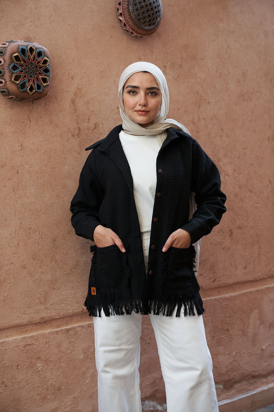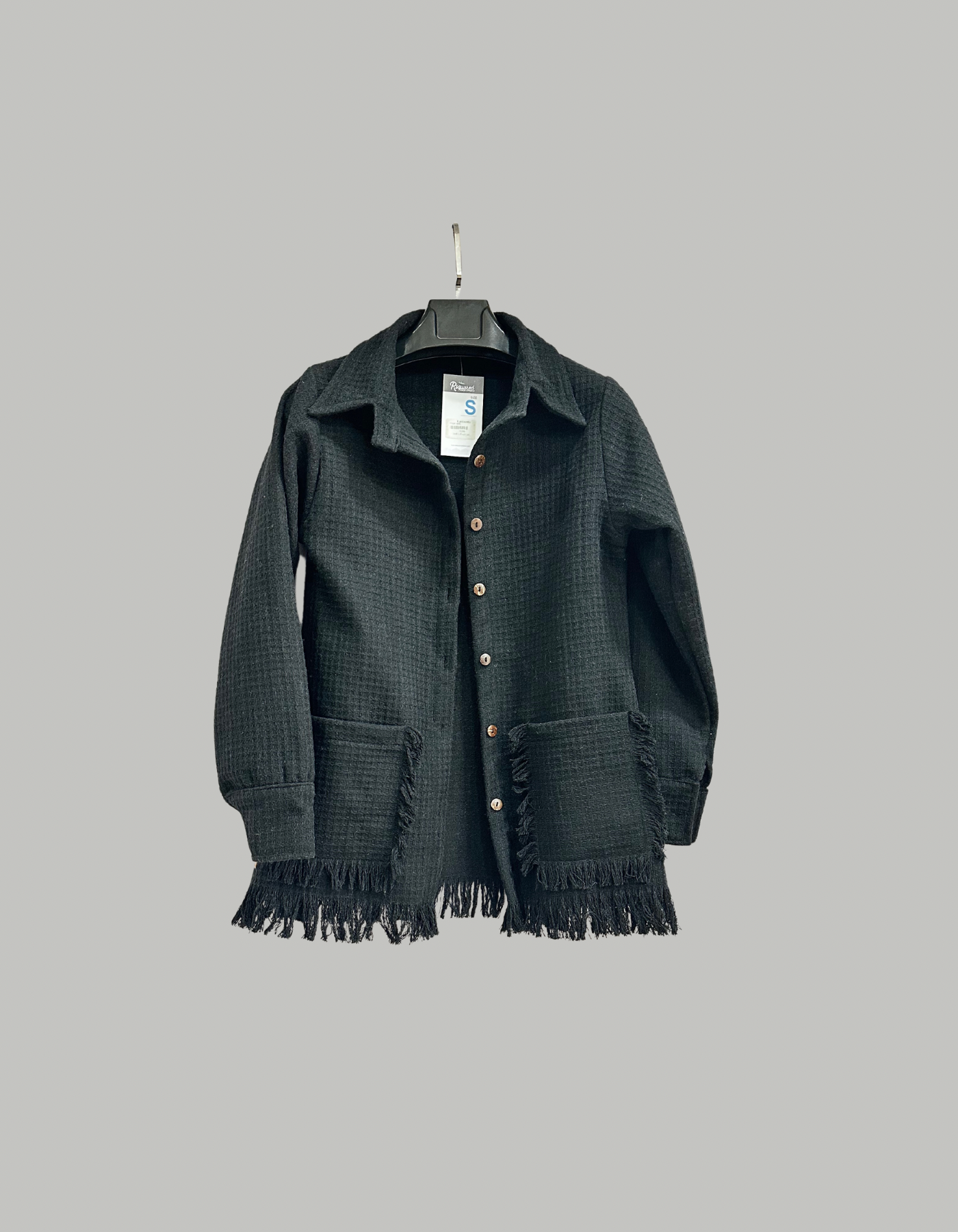 it looks chic and stylish. Featuring silver buttons and fringe detailing,