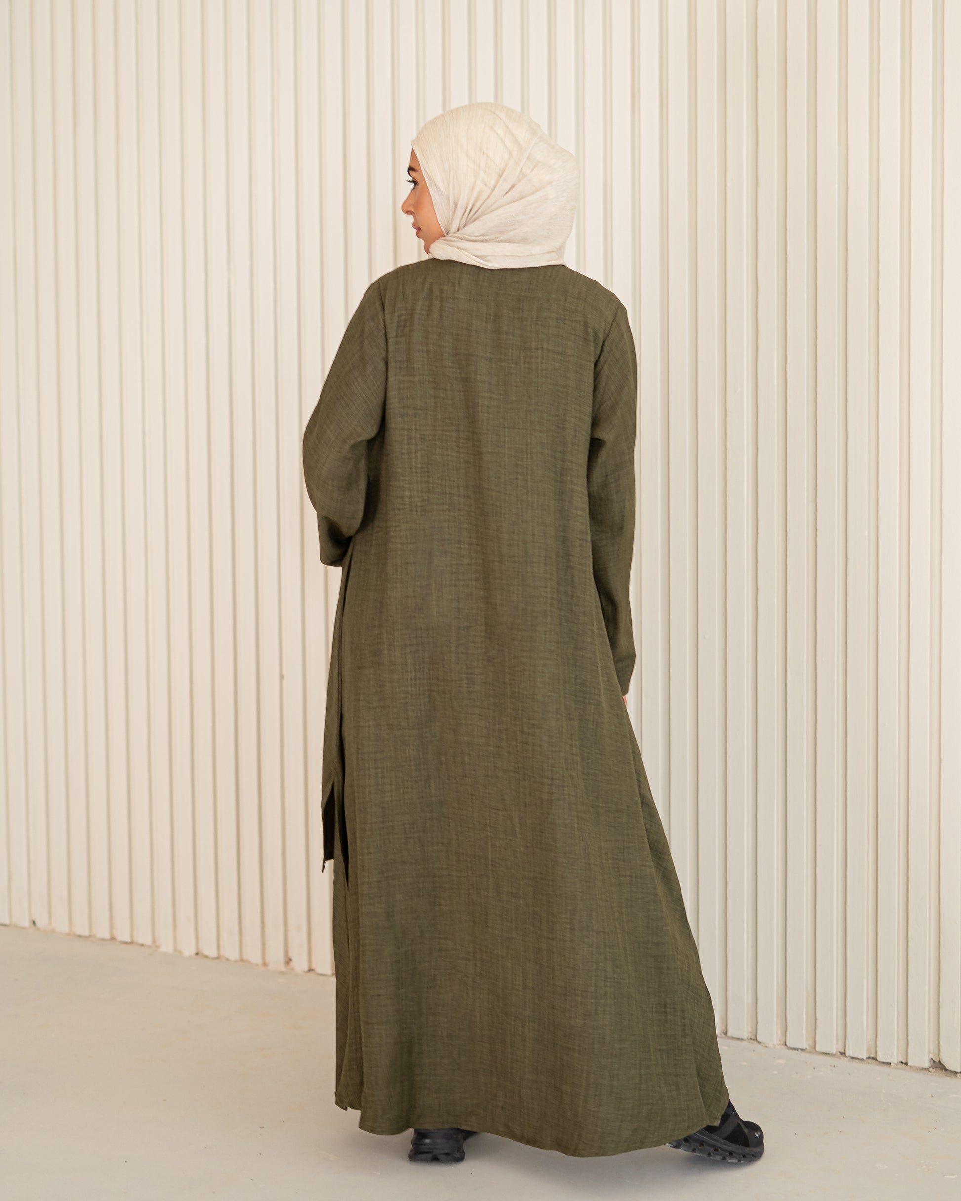 Made from breathable grey linen, the Stone Flow Dress features two side pockets and a beautifully uneven hem for a modern silhouette. Designed to honor simplicity, movement, and timeless modesty.