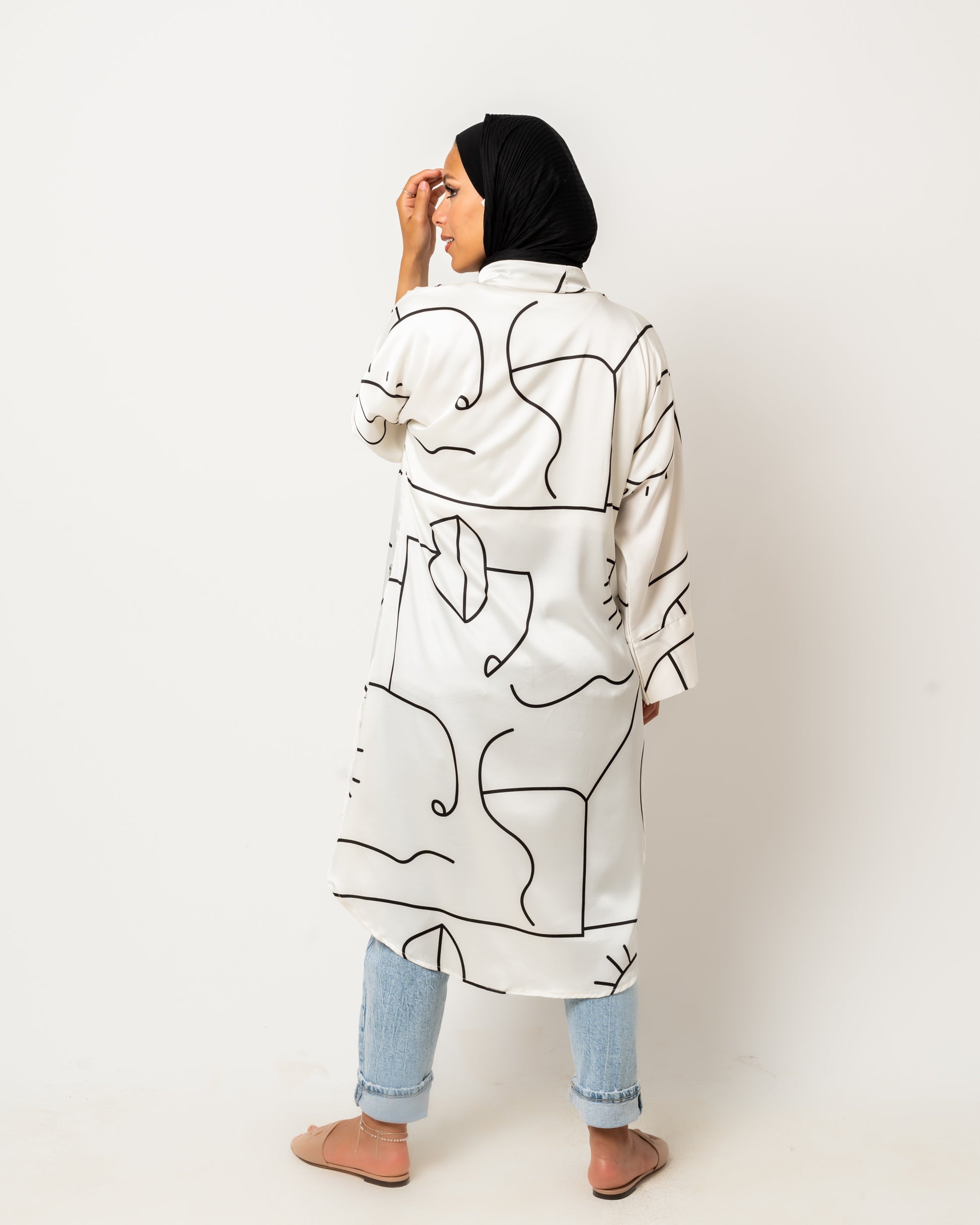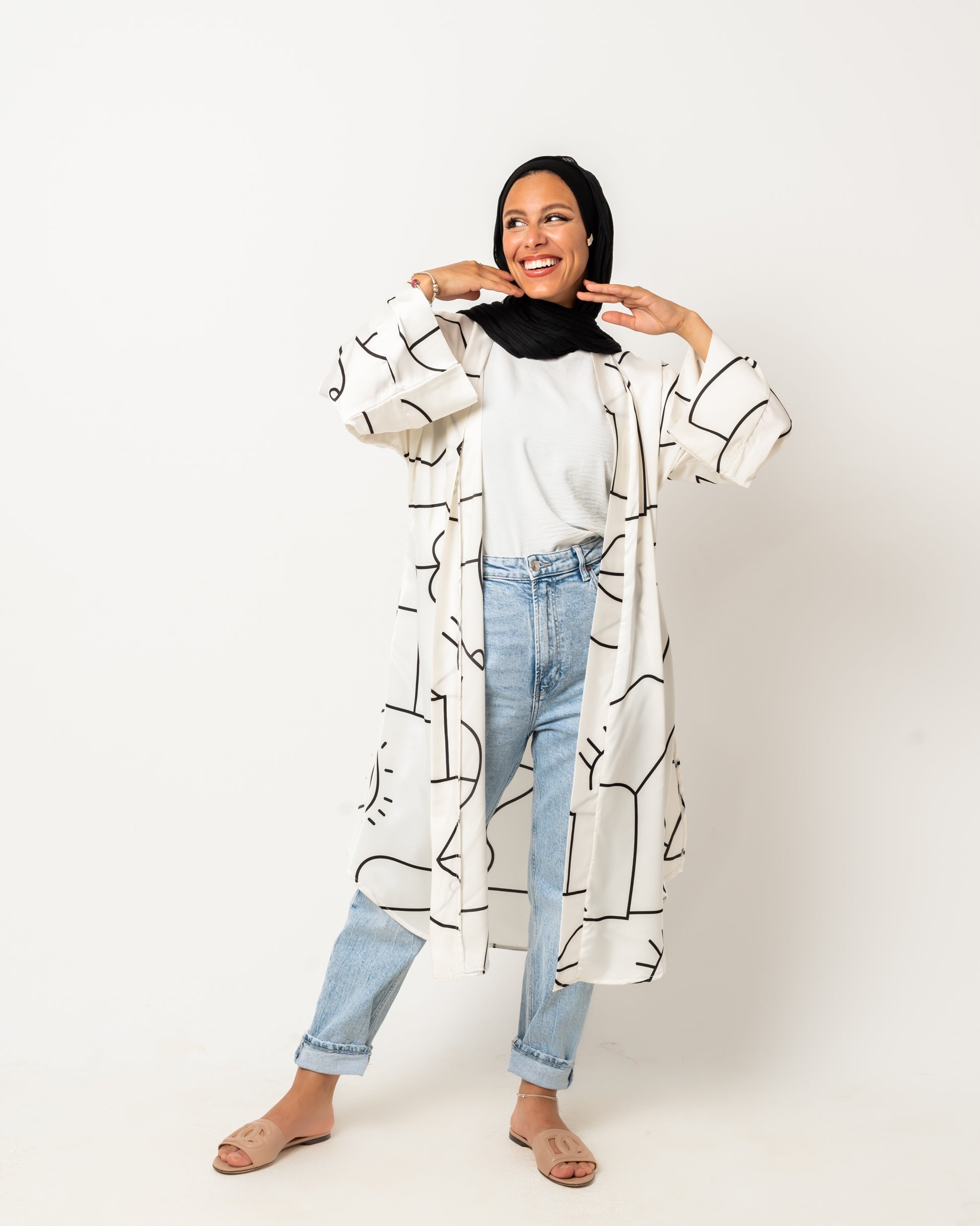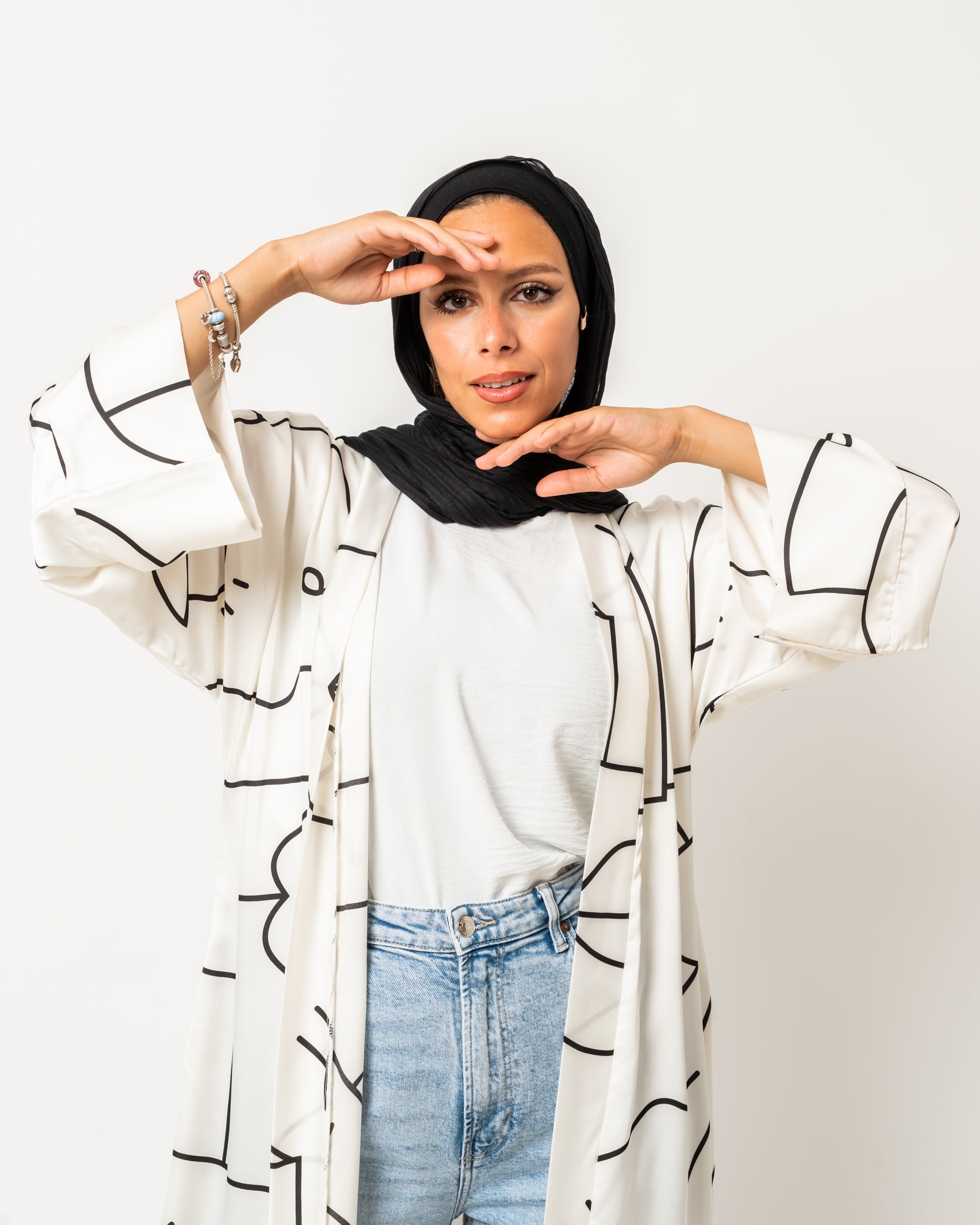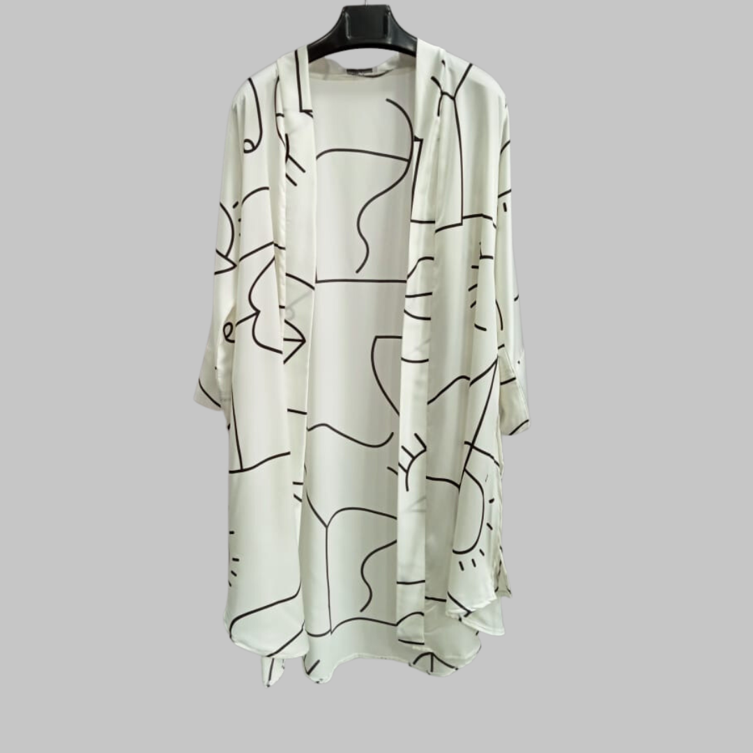 This 100% silk white kimono is a welcome addition to our summer wardrobe. The sleek design and minimalist black drawings are perfectly striking, making this an elegant and chic choice for any outfit.
