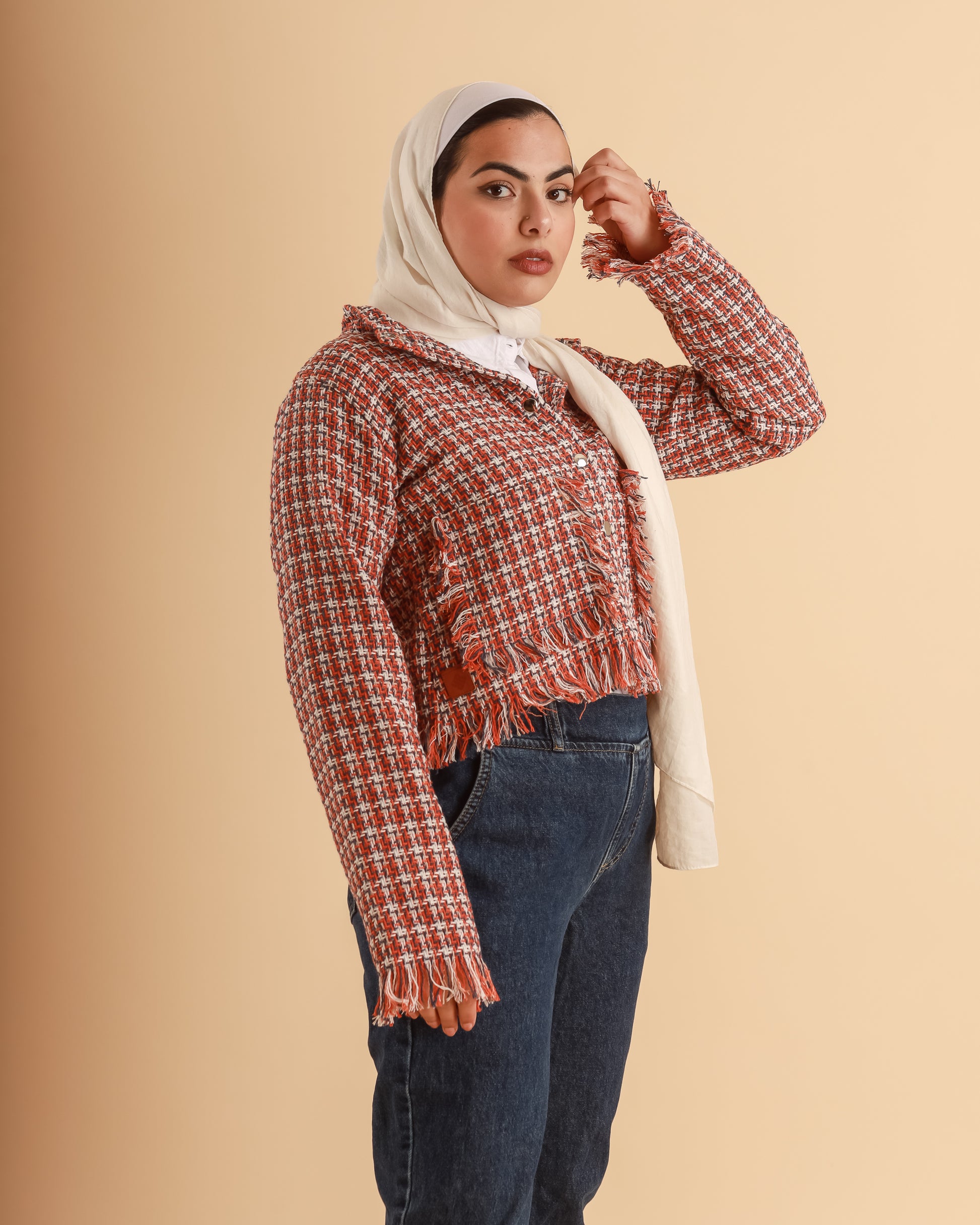 The tweed Jacket features a textured fabric with color threads and fringes on edges to create a unique look. Create an effortless look with the stylish blazer.
