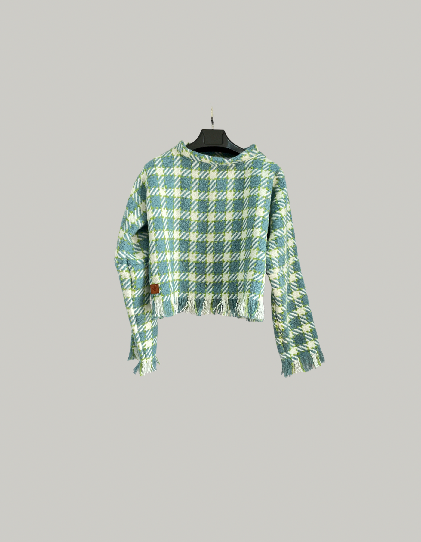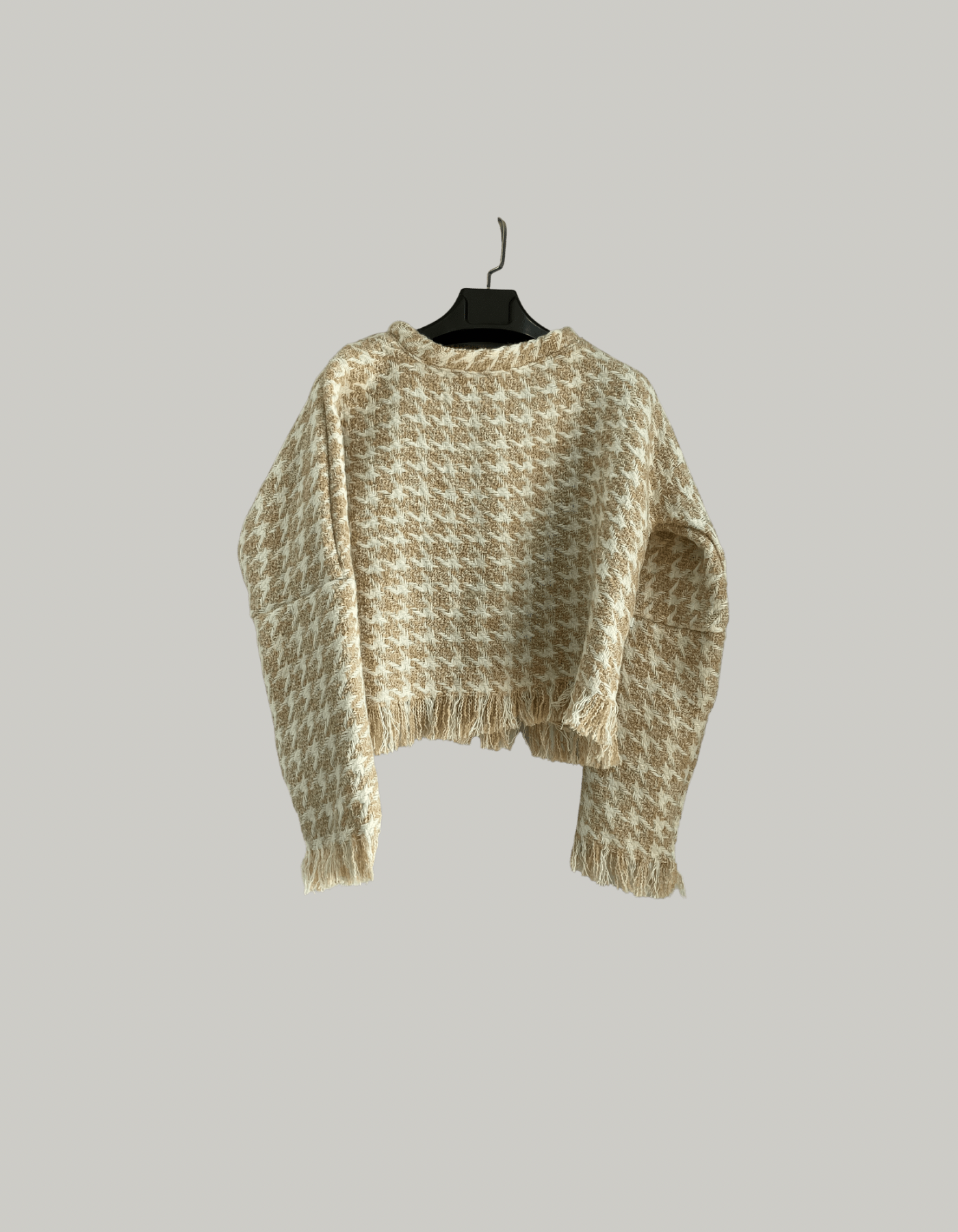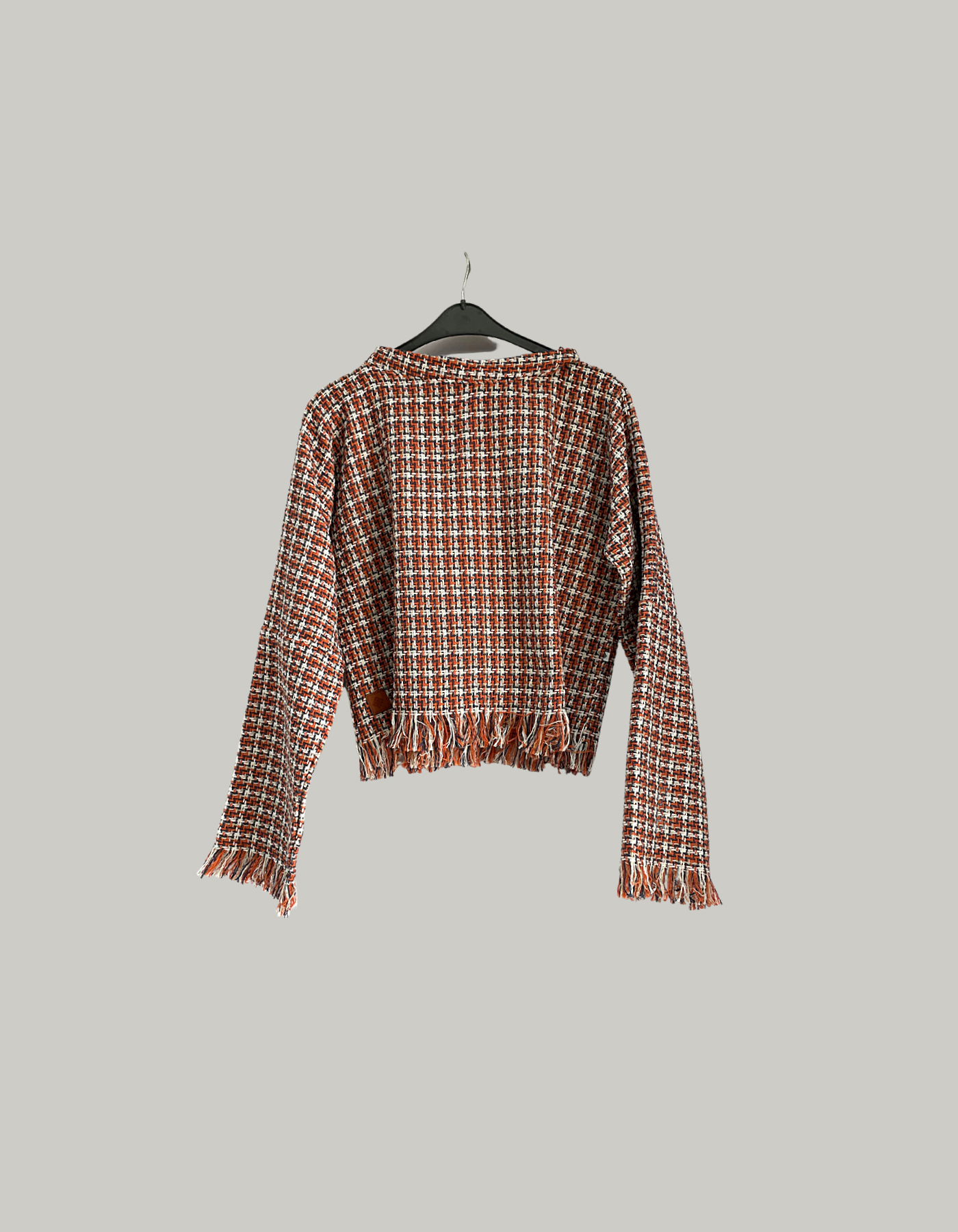 A classic sweater woven in tweed material. The oversized design Offers a slouchy fit, with fringes. Perfect for any occasion or mood. 50cm length